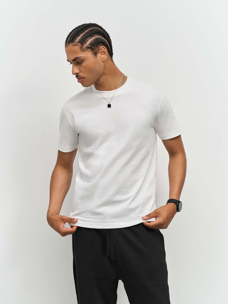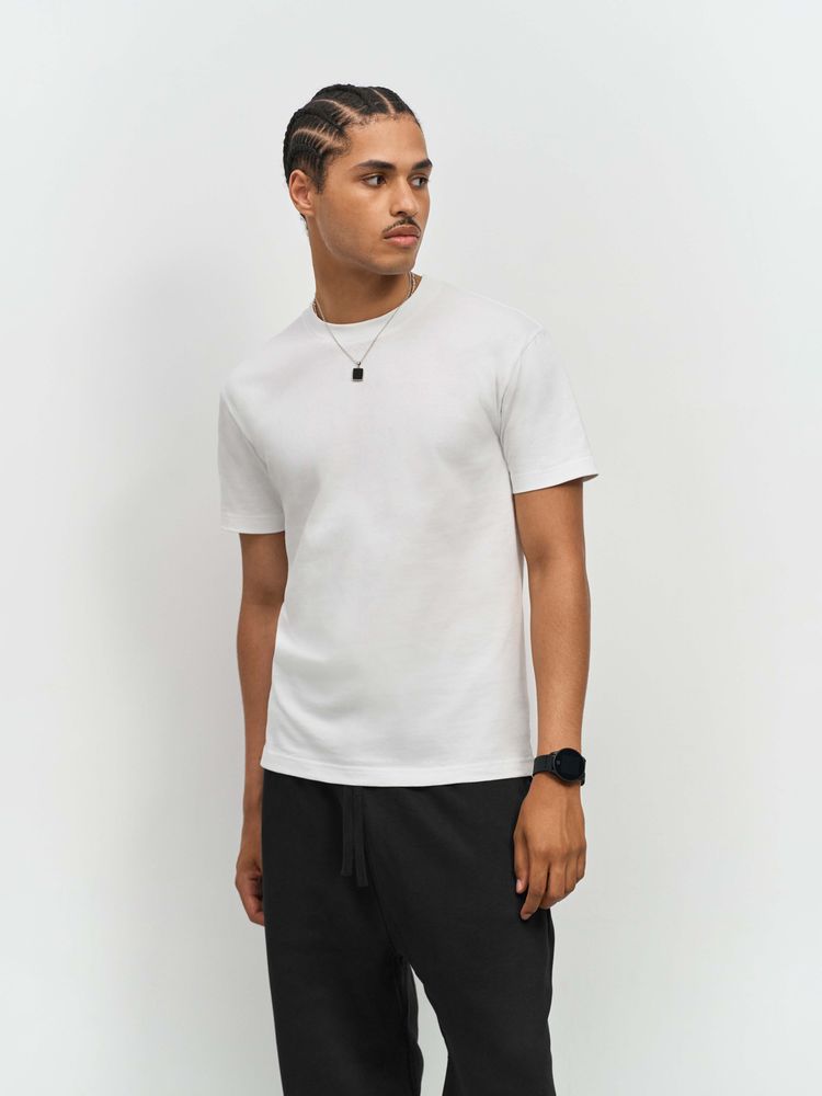 Ткань хорошо держит форму и не просвечивает, и при этом футболка остается футболка мягкой и приятной к телу. Особенности обработки волокна и конструкция с заметной высокой горловиной создает аутентичный образ с винтажной фактурой.