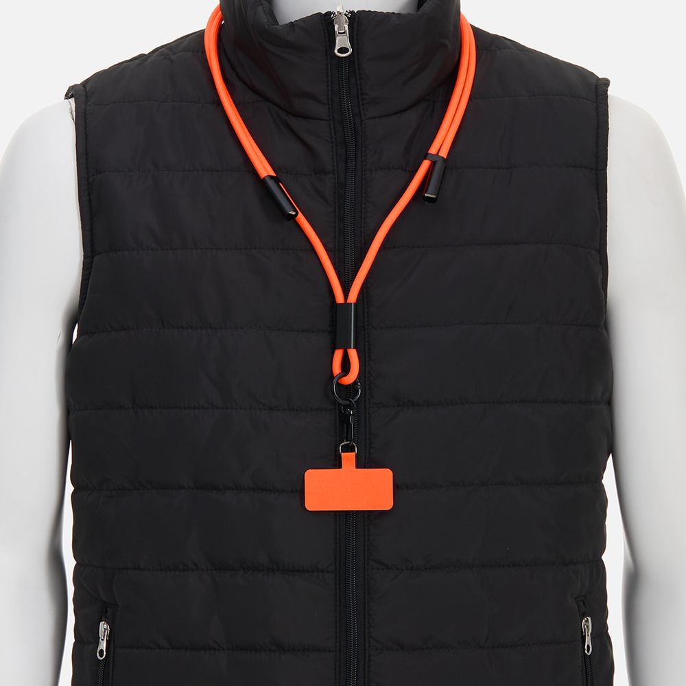 Важно: Для крепления кабеля телефон должен иметь чехол. Если ланьярд распускается под тяжестью смартфона, убедитесь, что среднее из трех колец фурнитуры находится по центру ланьярда (на шее под затылком), а не сбоку. Соседние ветви оплетки должны идти вместе, без зазоров, так достигается трение ткани о ткань.