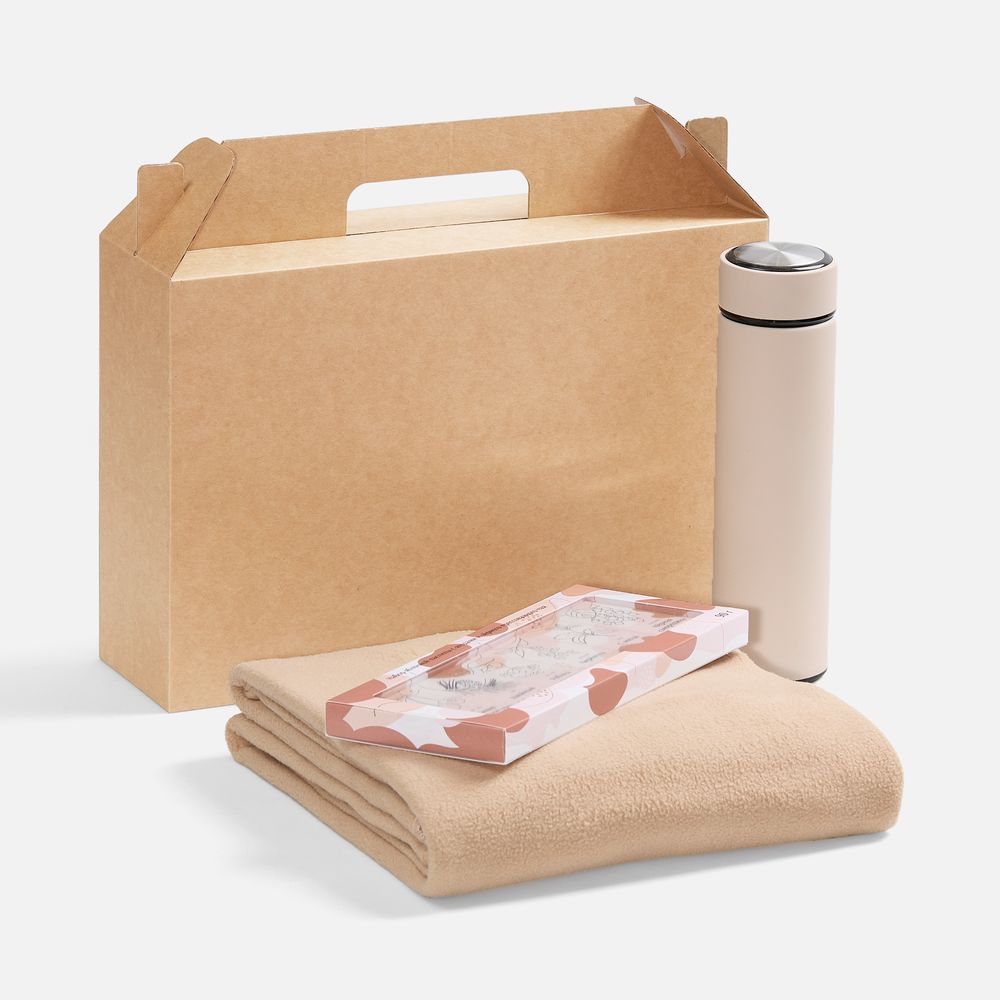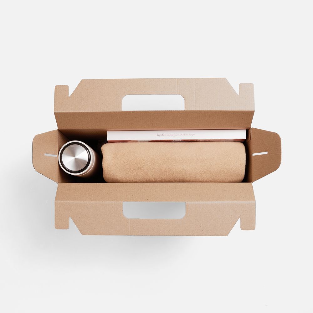 термос — нержавеющая сталь, покрытие софт-тач; плед — флис; коробка — микрогофрокартон