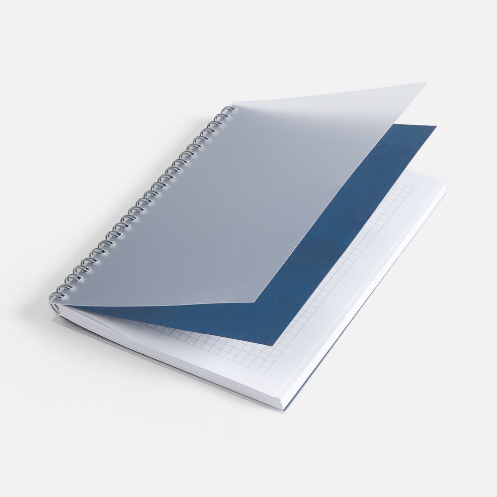 Блокнот в клетку на металлической пружине с двойной обложкой. Верхняя вставка из полупрозрачного матового пластика добавляет жесткости, расширяет возможности нанесения, а также придает обычному блокноту на пружине более современный вид.