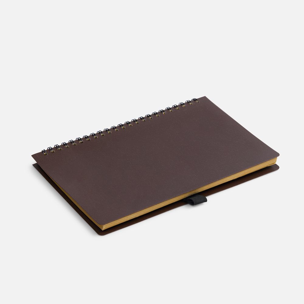 Блокнот на спирали из пластика и кофейного жмыха, дополнен резинкой для ручки.