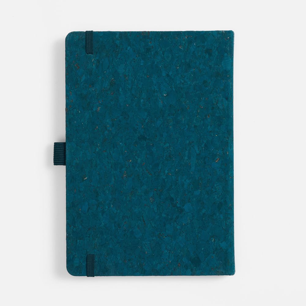 Блокнот с твердой обложкой из натуральной окрашенной пробки, дополнен петлей-резинкой для ручки, ляссе и резинкой в цвет обложки.