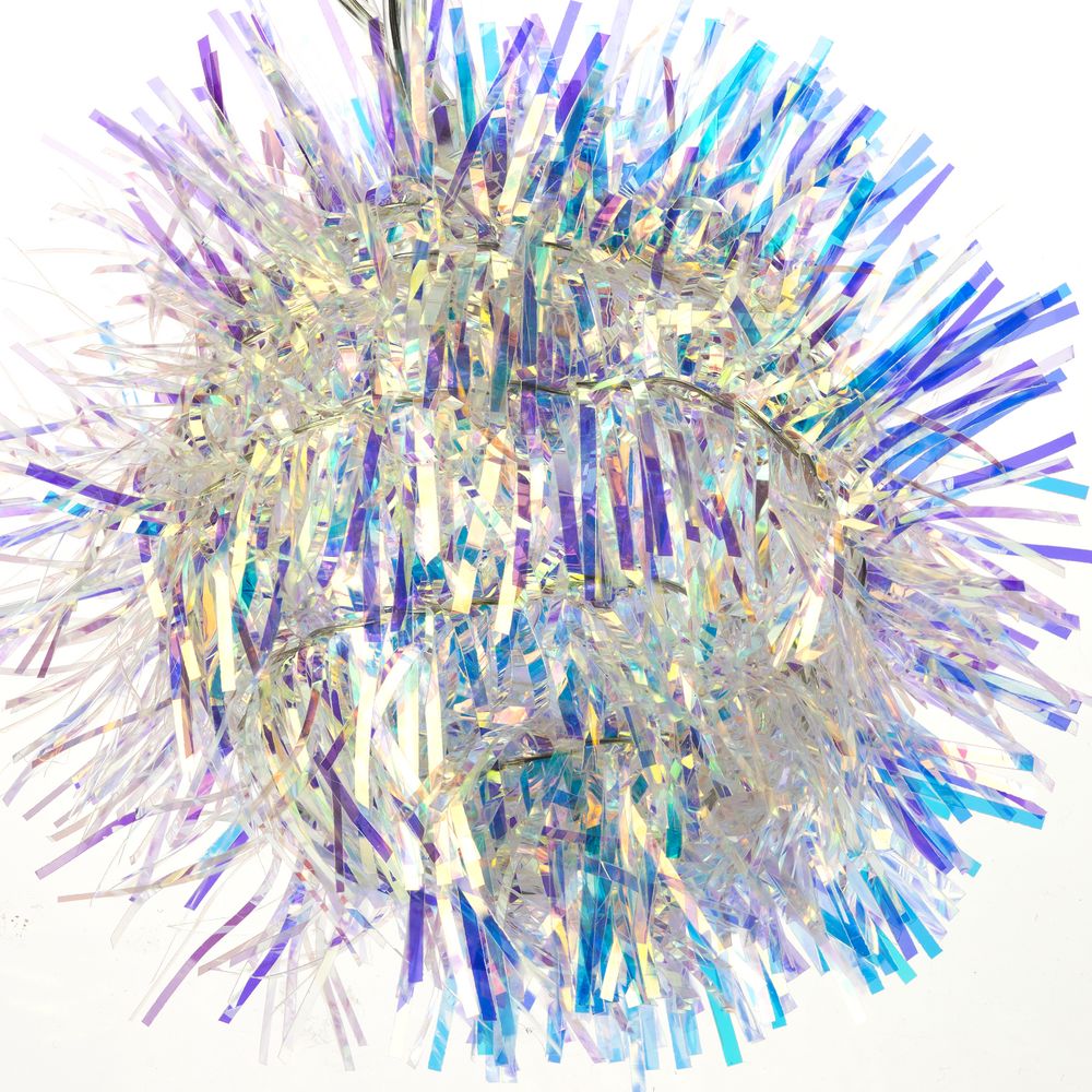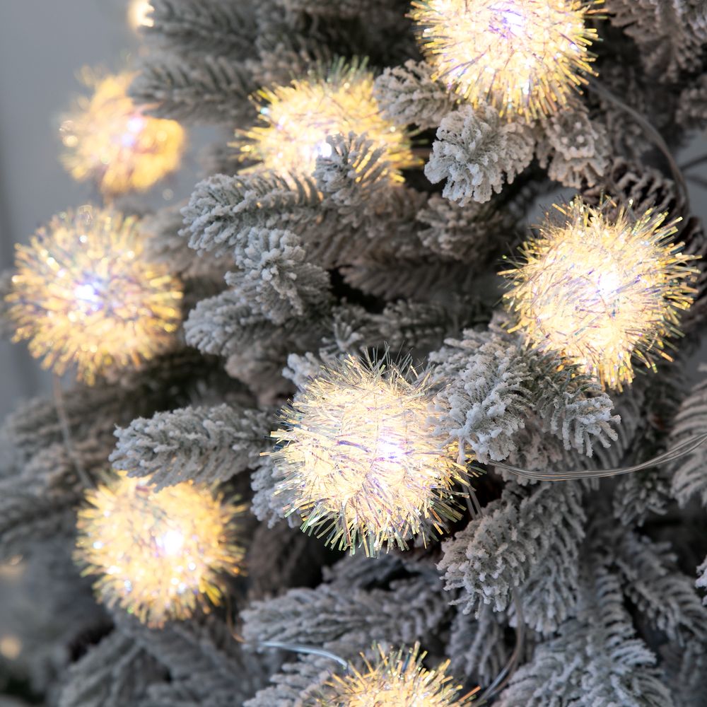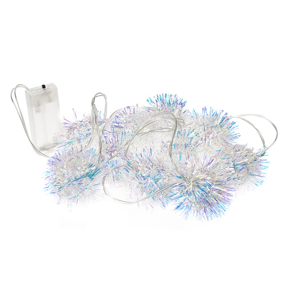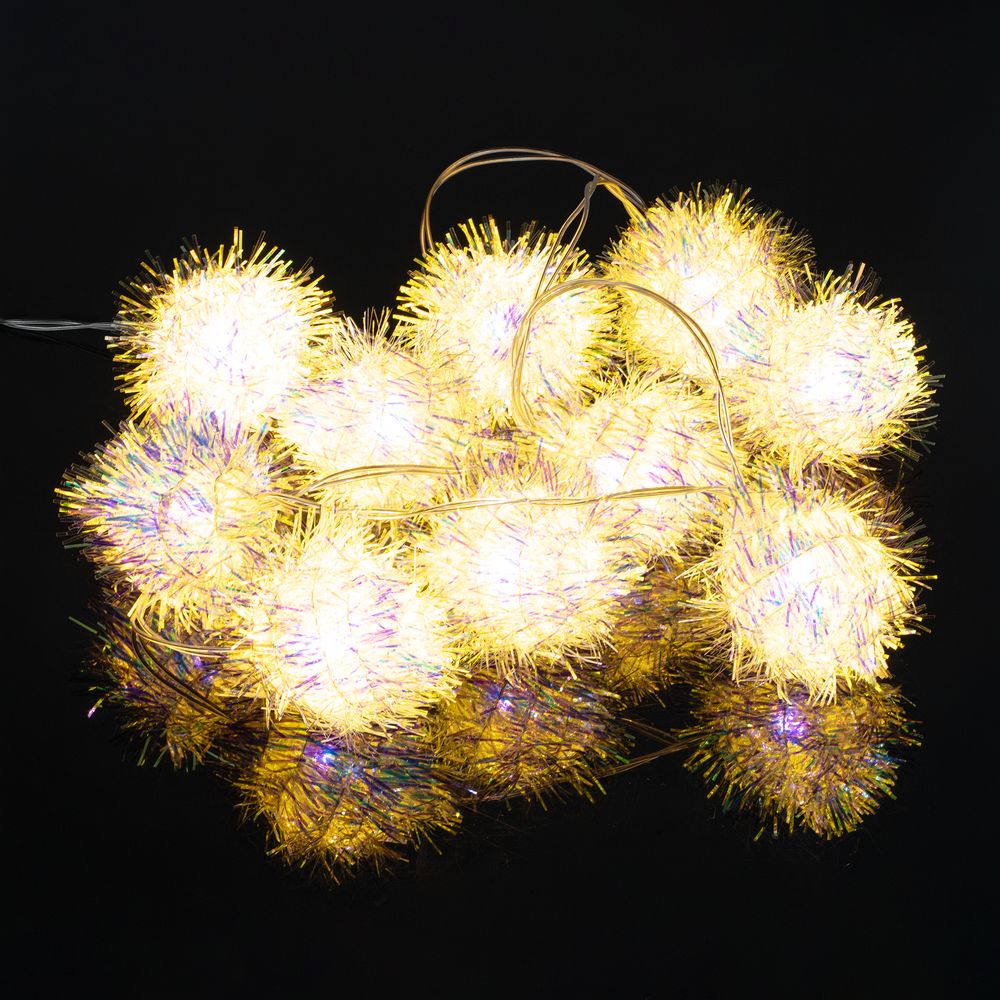 10 помпонов с мишурой с лампочками теплого света. Работает от 2 батареек АА (в комплект не входят).