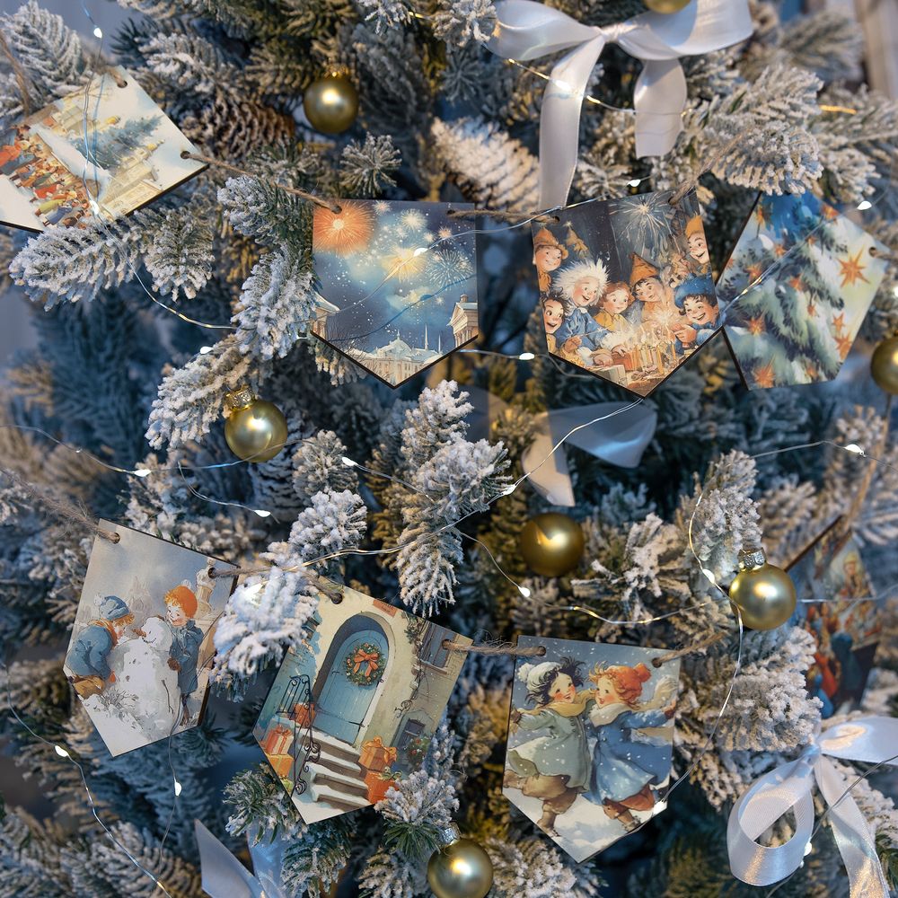 Очаровательная гирлянда из деревянных флажков с винтажными рождественскими иллюстрациями для создания уютной праздничной атмосферы дома или в офисе. Каждый флажок украшен теплым, душевным сюжетом — будто сошедшим со старинных открыток. Они с легкостью перенесут в мир новогодних сказок и детских фантазий — туда, где и хочется оказаться в самое волшебное время года!