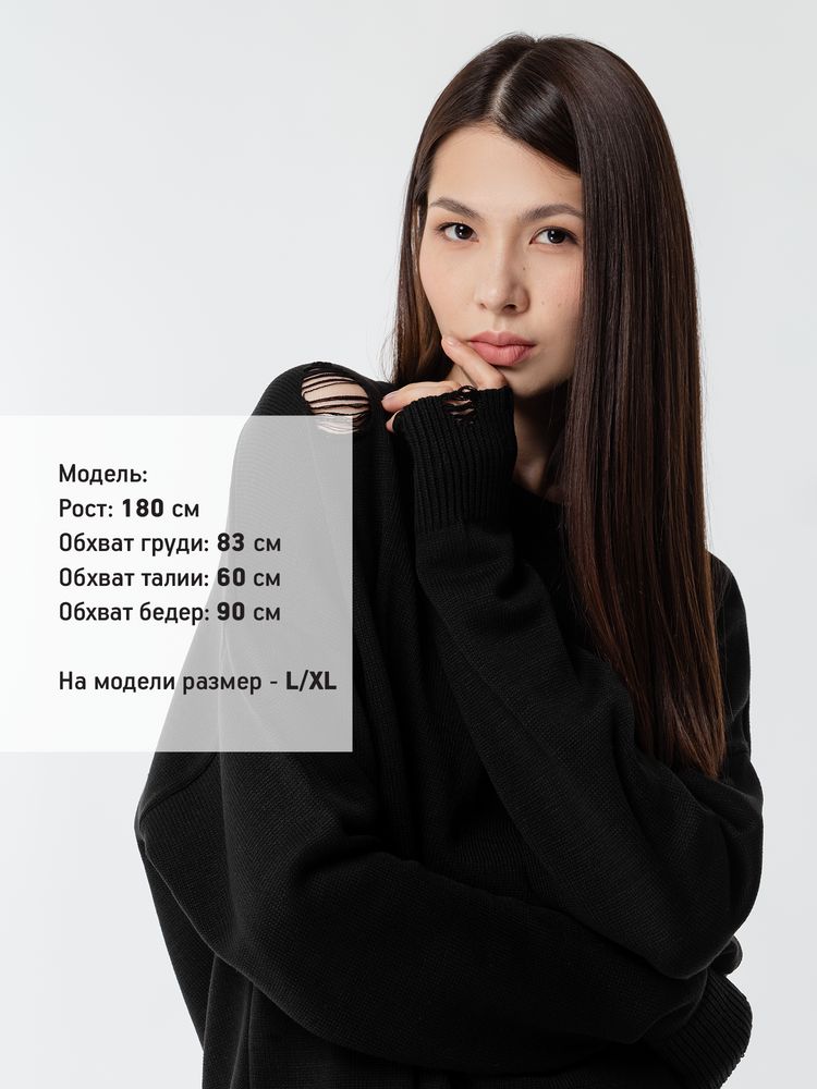 Оверсайз джемпер с круглым вырезом и рваными краями. Ворот, манжеты и низ изделия выполнены резинкой.