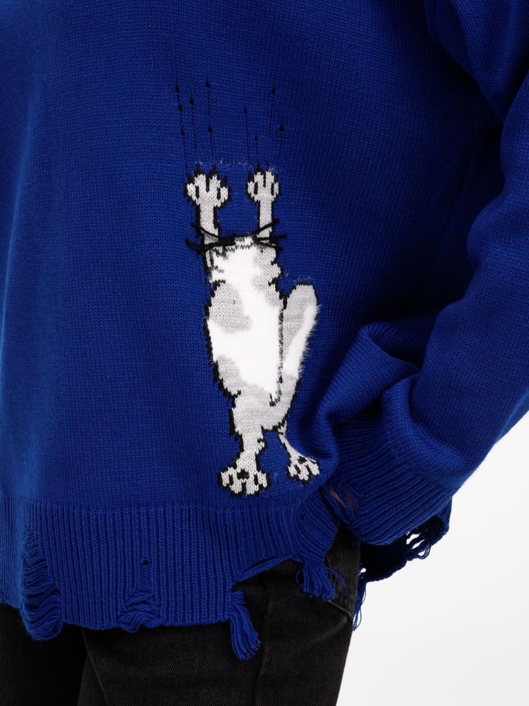 В дизайне мягкого джемпера с круглым вырезом Sharpick гранж-эстетика органично сочетается с милым акцентом — пушистым рисунком в виде озорного котика. Получается веселая вариация на тему того, откуда берется модная рваная одежда, а джемпер моментально создает настроение легкой несерьезности. Рваные края изделия добавляют современную нотку, а резинка на вороте, манжетах и по низу обеспечивает удобную посадку.