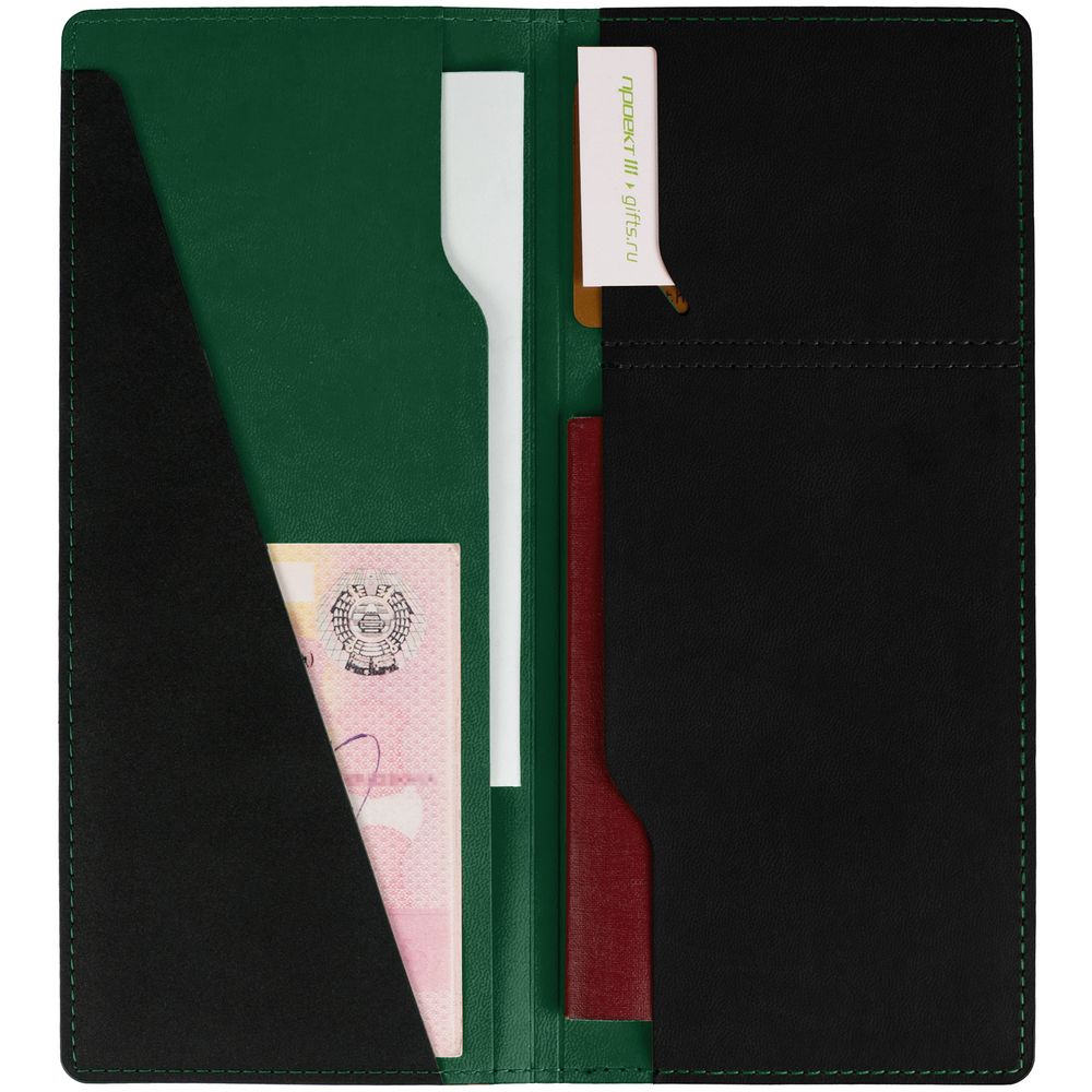 Имеет 5 отделений: для билетов, паспорта, визиток или кредитных карт.
