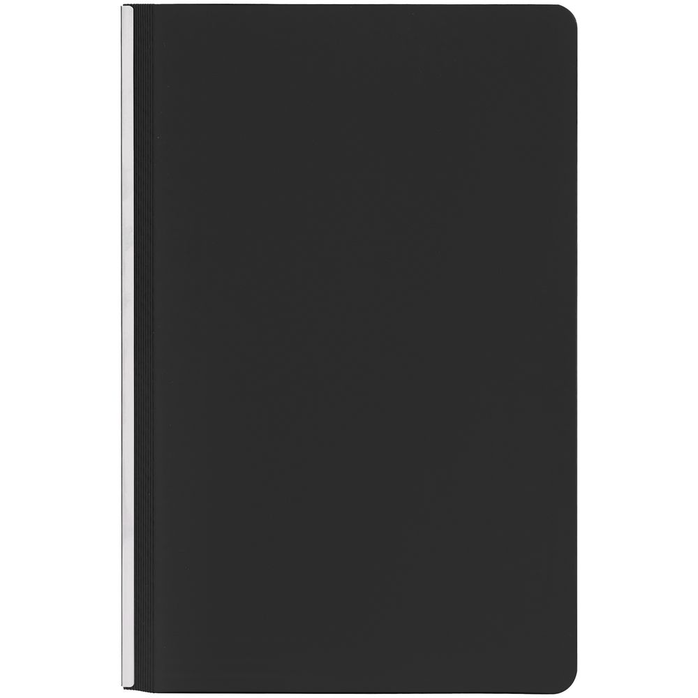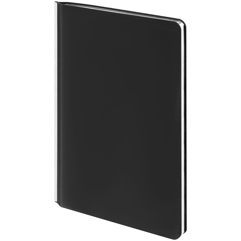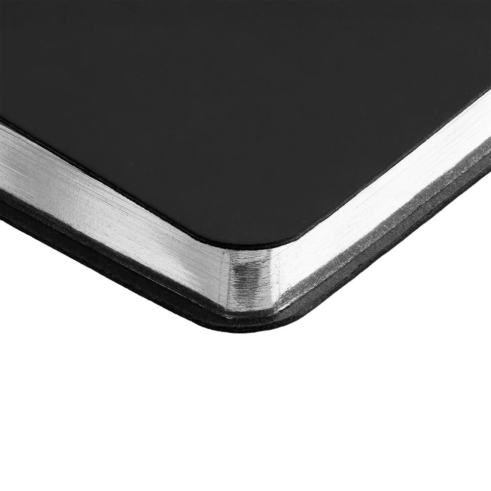 Ежедневник с гибкой обложкой и металлическим корешком, выполнен из материала Soft Touch, черный АА, дополнен серебристым обрезом блока и ляссе.