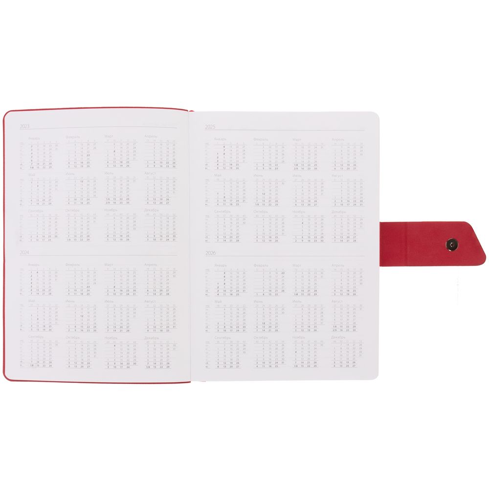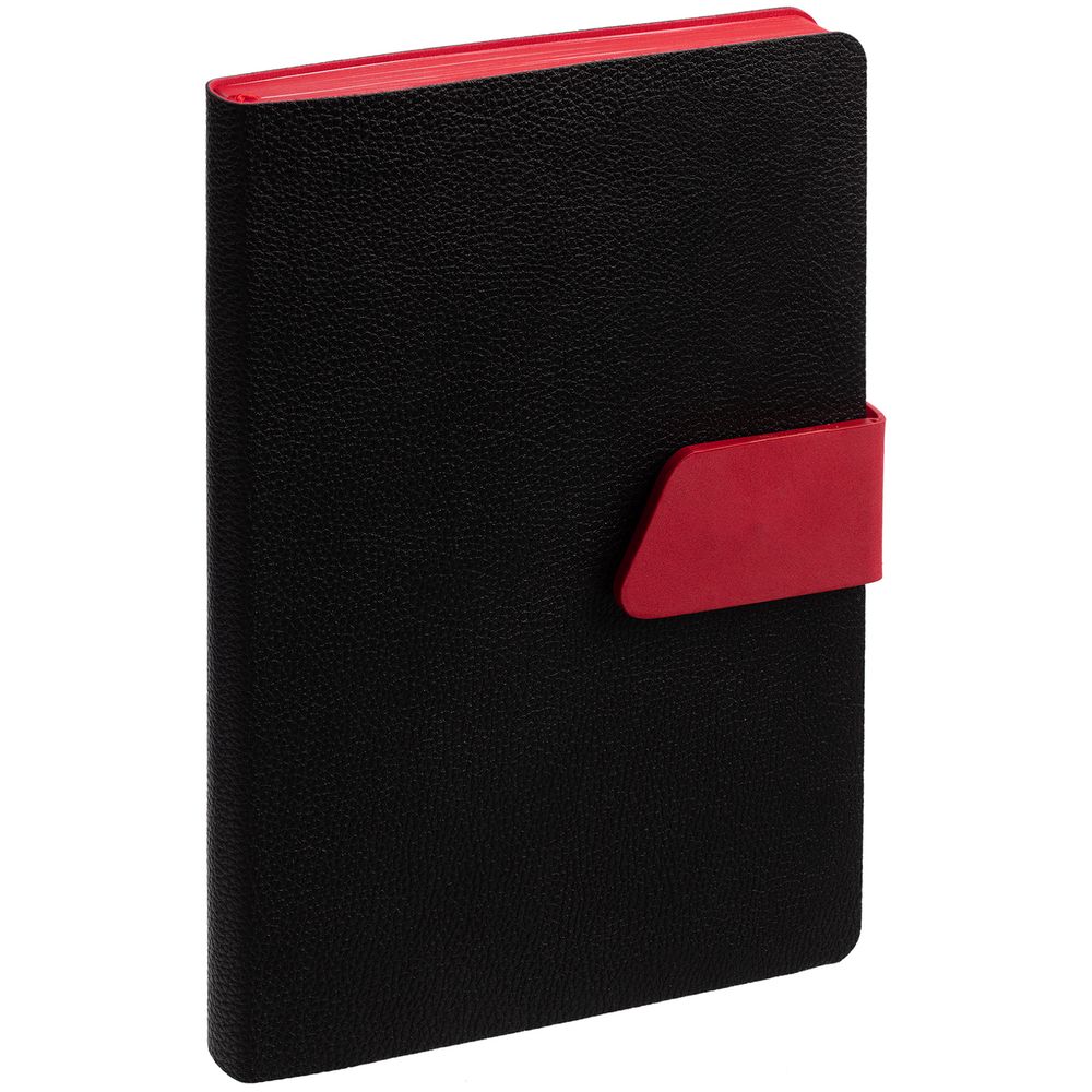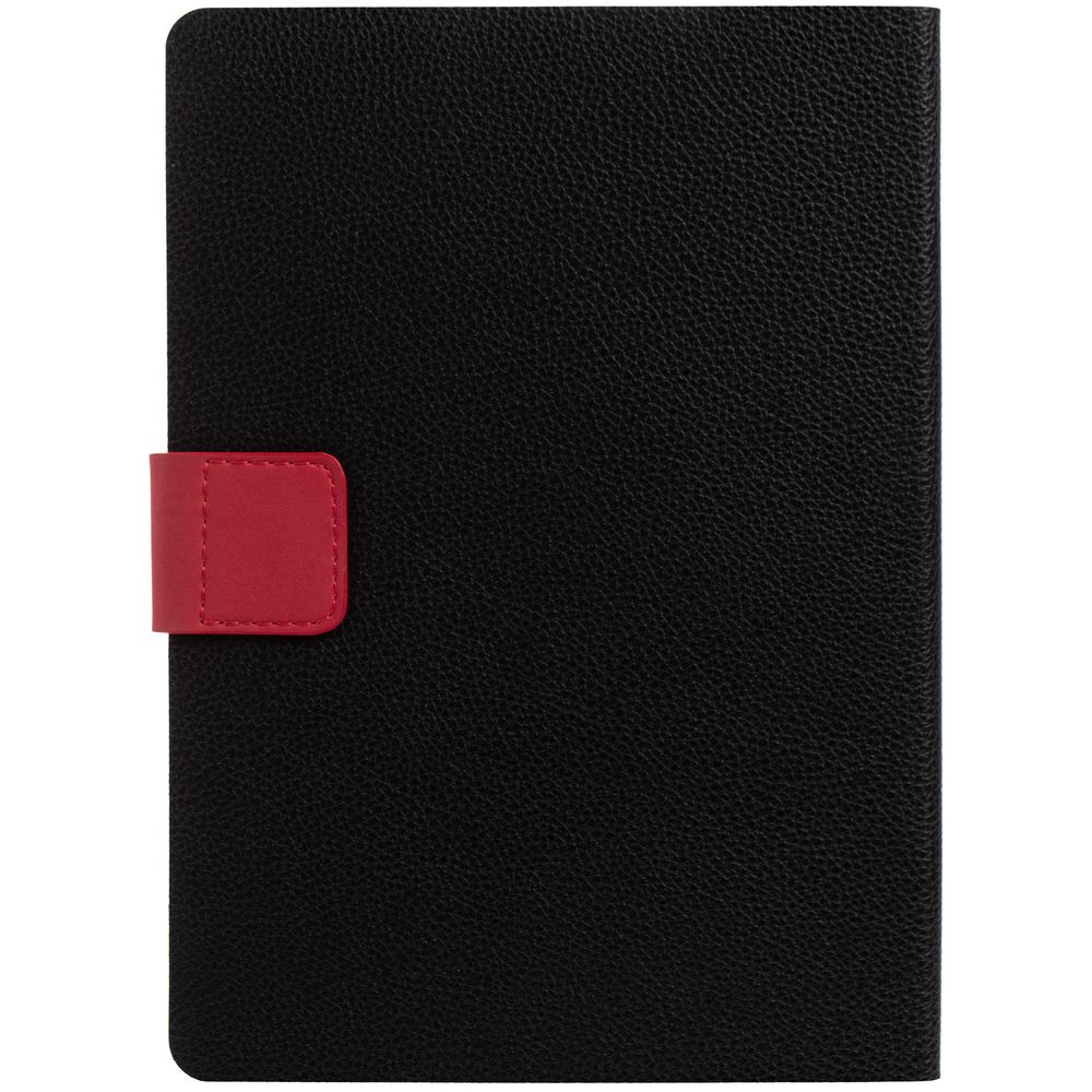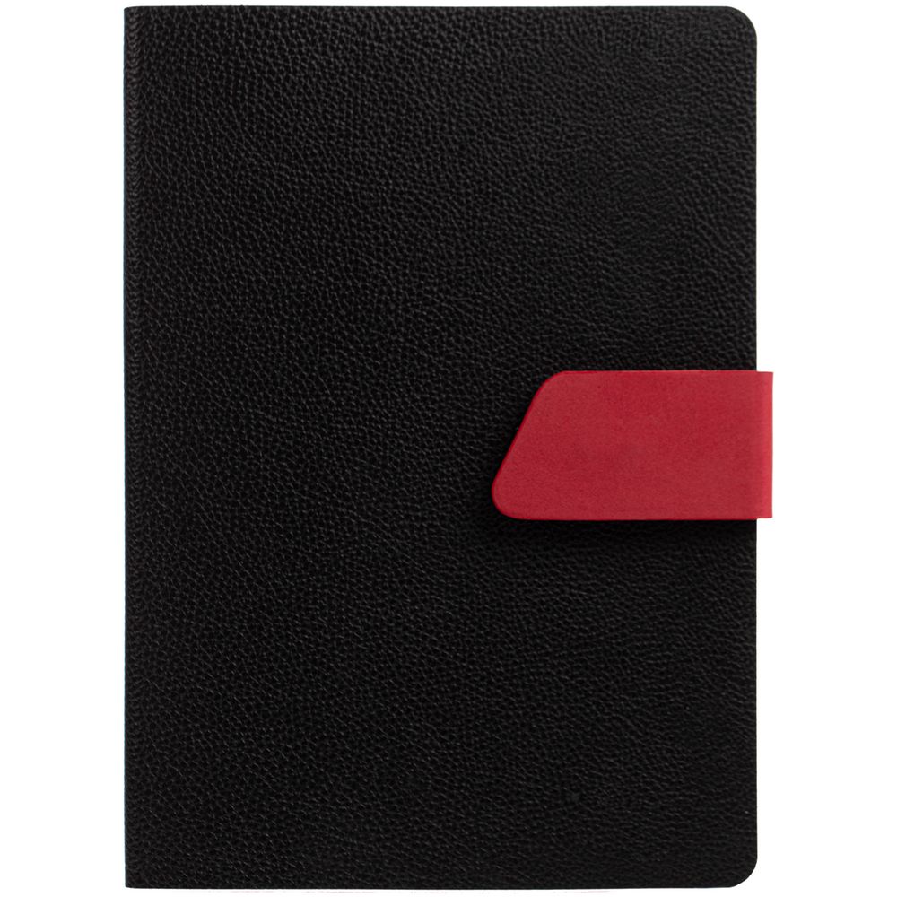 Ежедневник с гибкой обложкой, выполнен из материала La Fite, черный АА и Nubuck, красный РР, дополнен красным ляссе и хлястиком на кнопке.