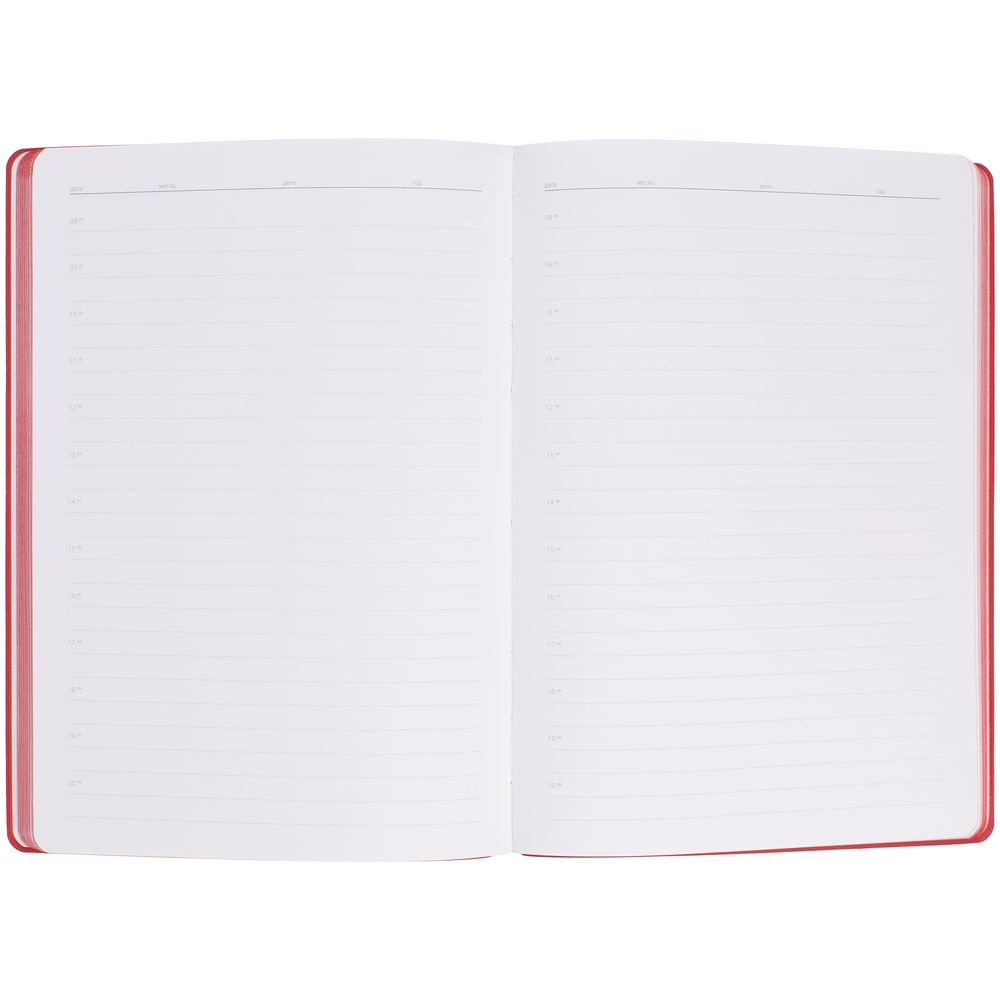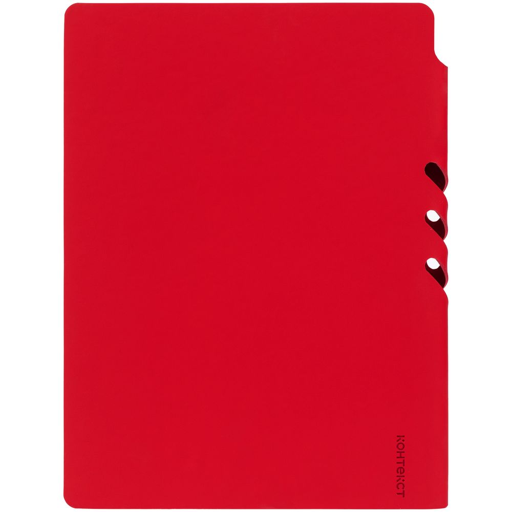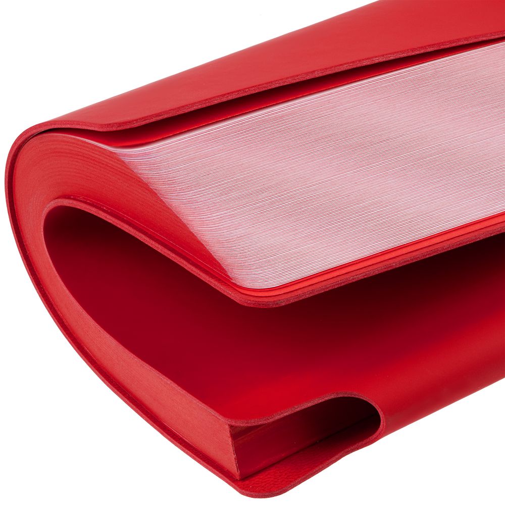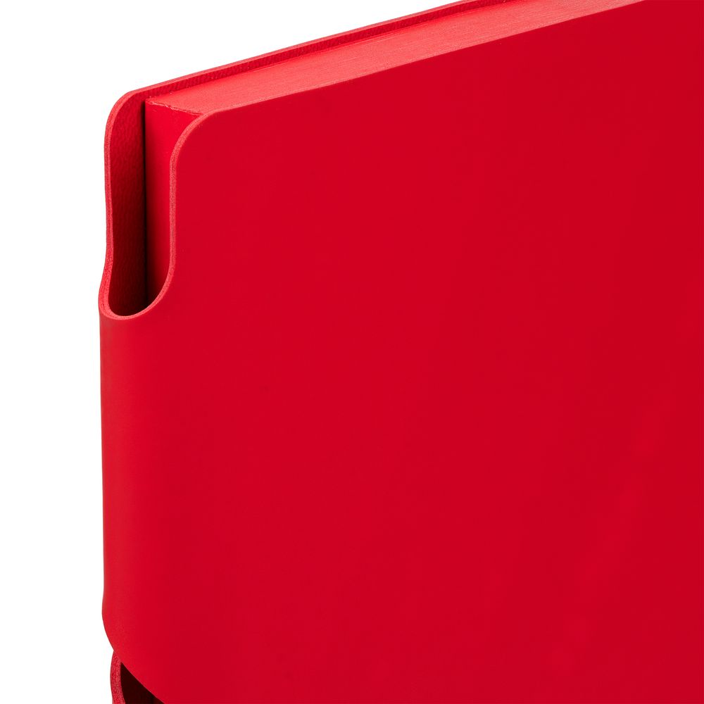 Гибкая обложка выполнена из материала Soft Touch Ultra, красный РР и Latte, красный РР (внутренняя часть обложки). Внутри корешка — специальное место для крепления ручки размером до 15х1 см.