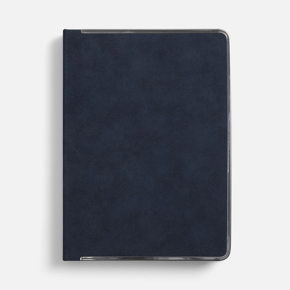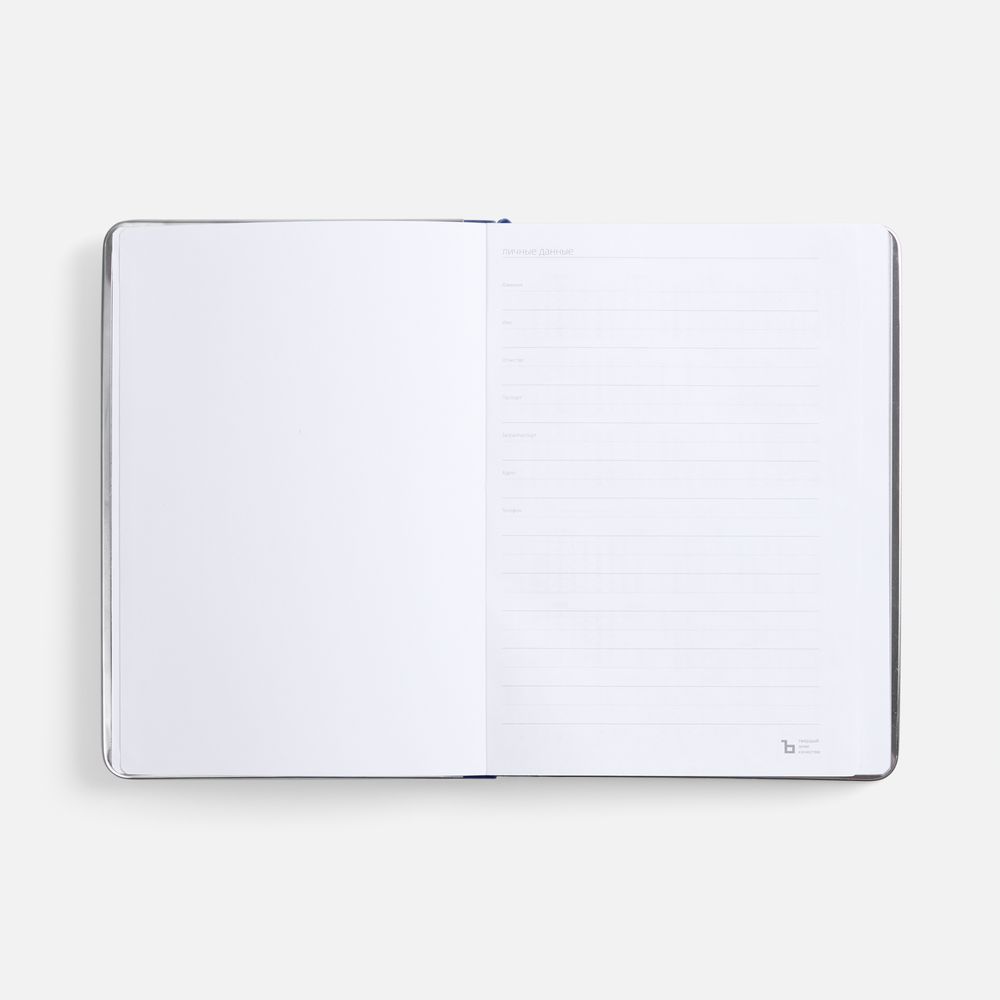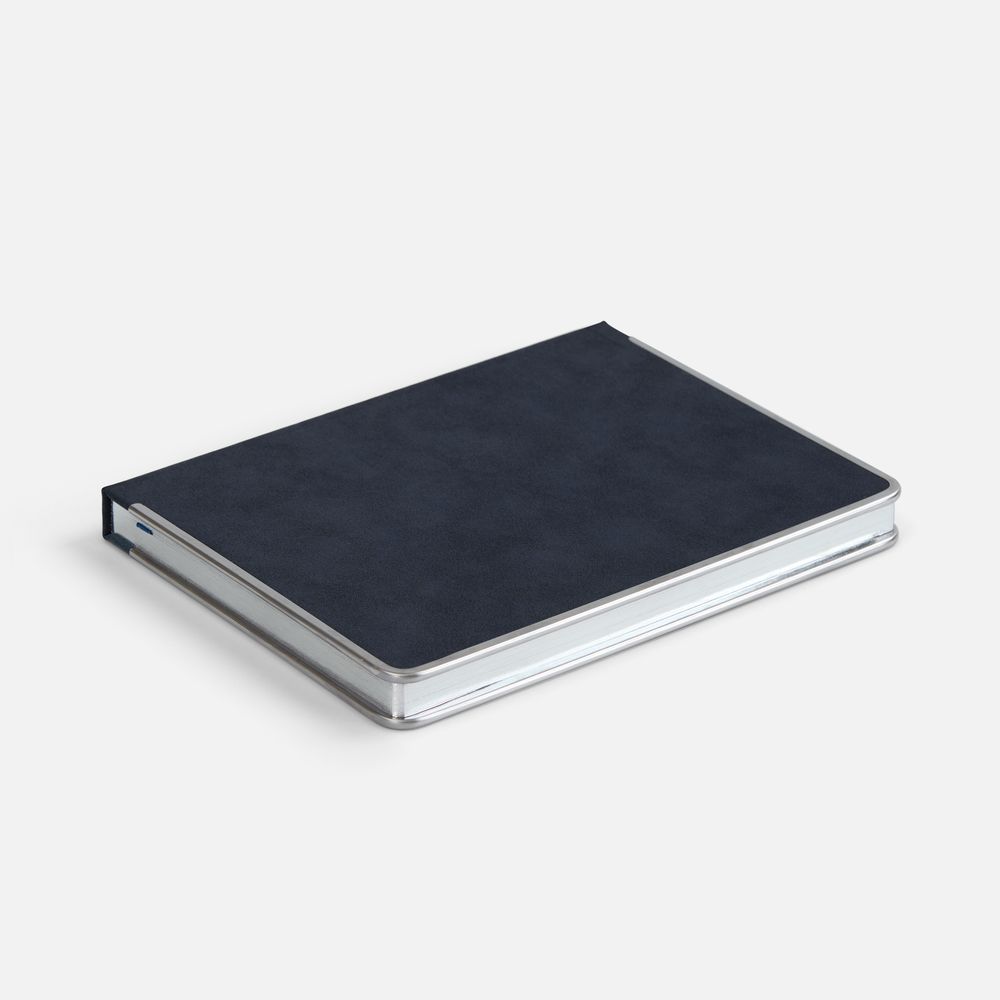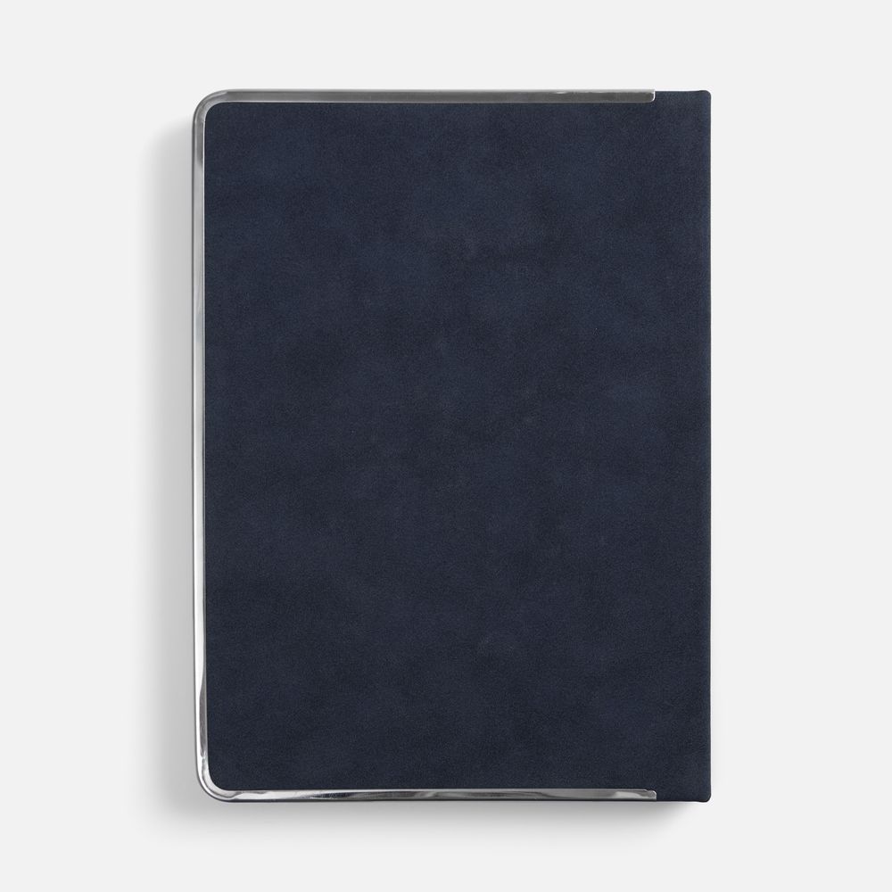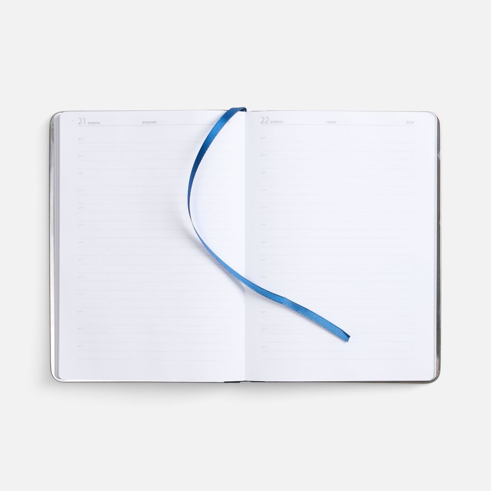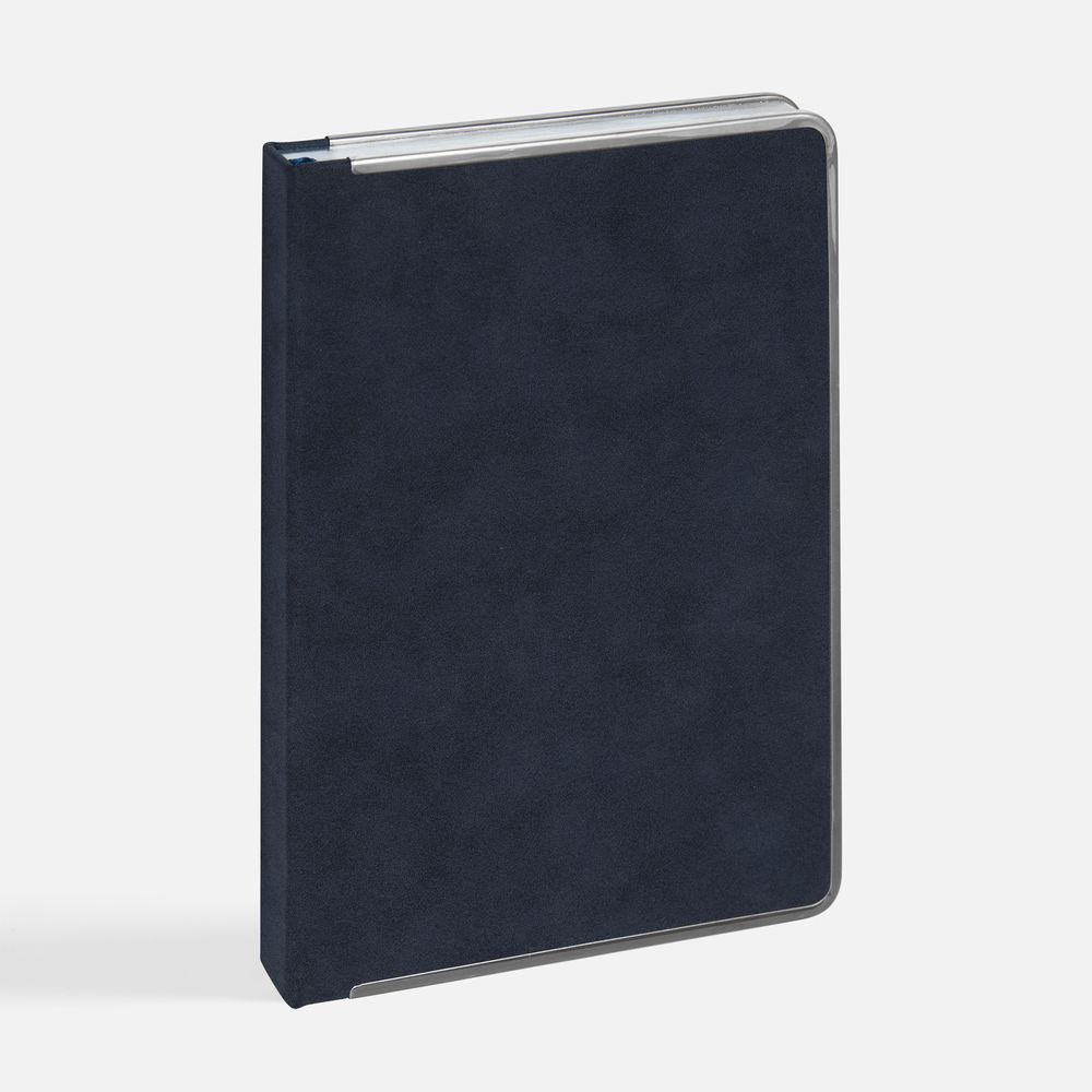 Ежедневник с твердой обложкой и серебристым  обрезом блока. Выполнен из материала Nubuck, темно-синий ХХ, дополнен синим ляссе ляссе и металлическими рамками с двух сторон обложки.