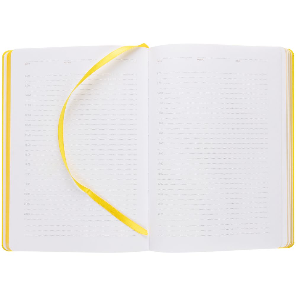 Ежедневник с твердой обложкой, выполнен из материала Latte, желтый КК, обрез зеленого цвета, дополнен резинкой и ляссе желтого цвета.