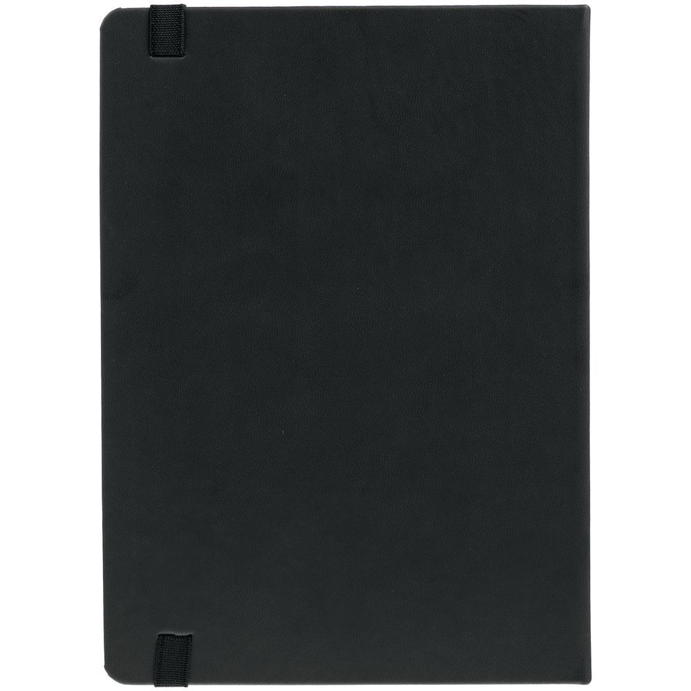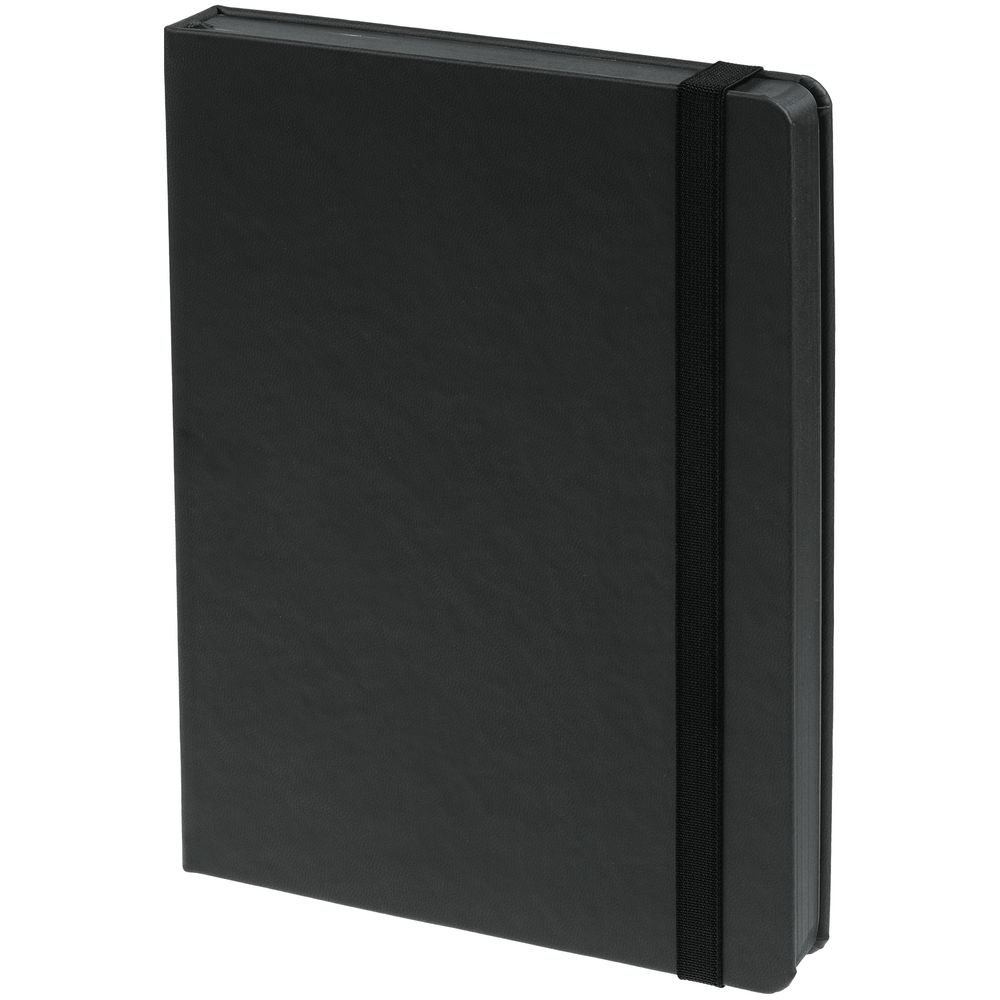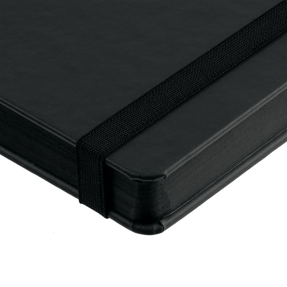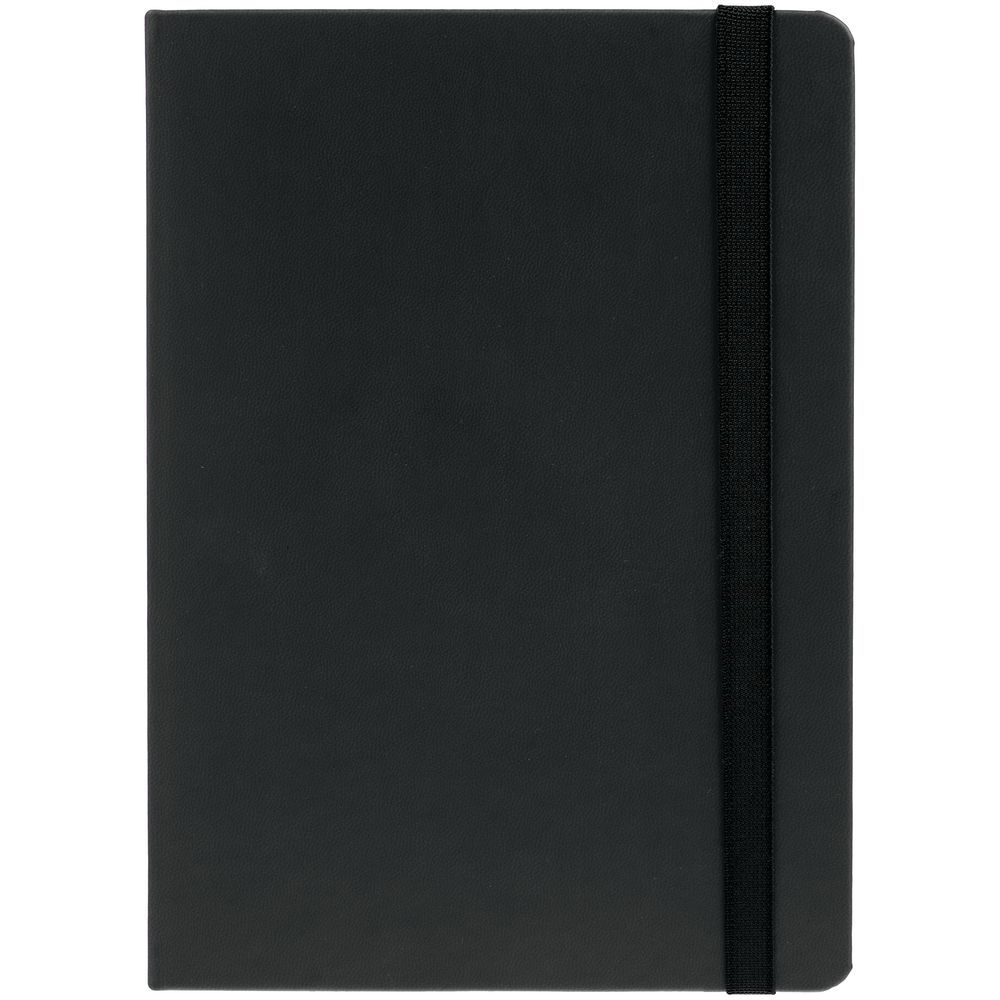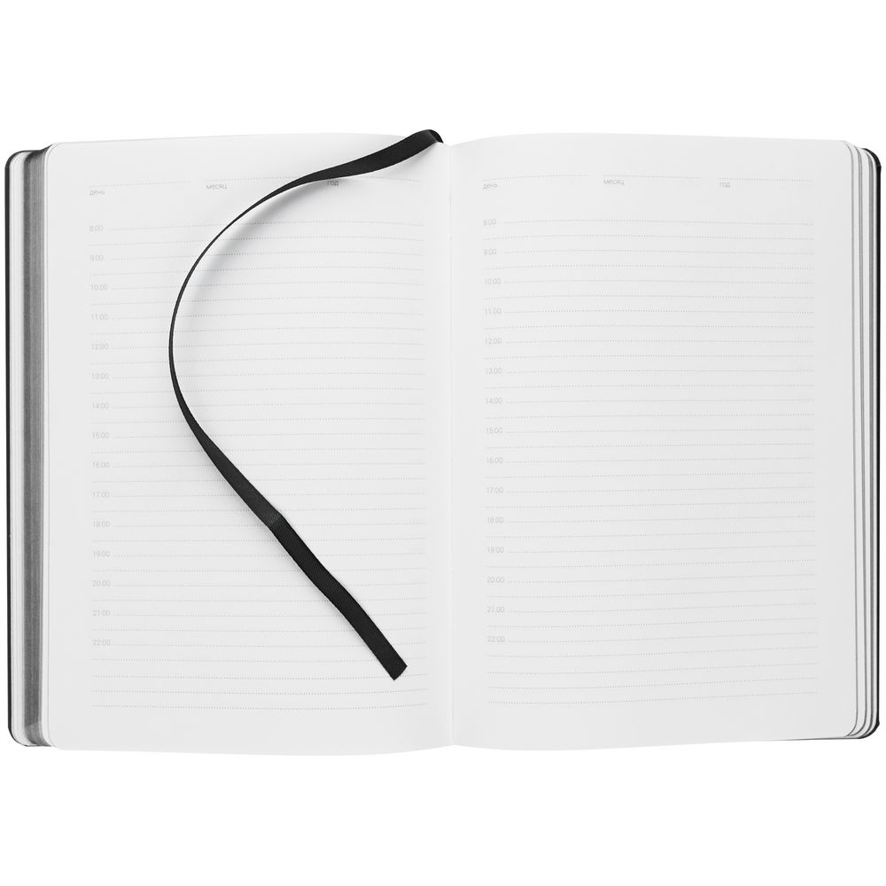 Ежедневник с твердой обложкой, выполнен из материала Latte, черный АА, обрез черного цвета, дополнен резинкой и ляссе черного цвета.