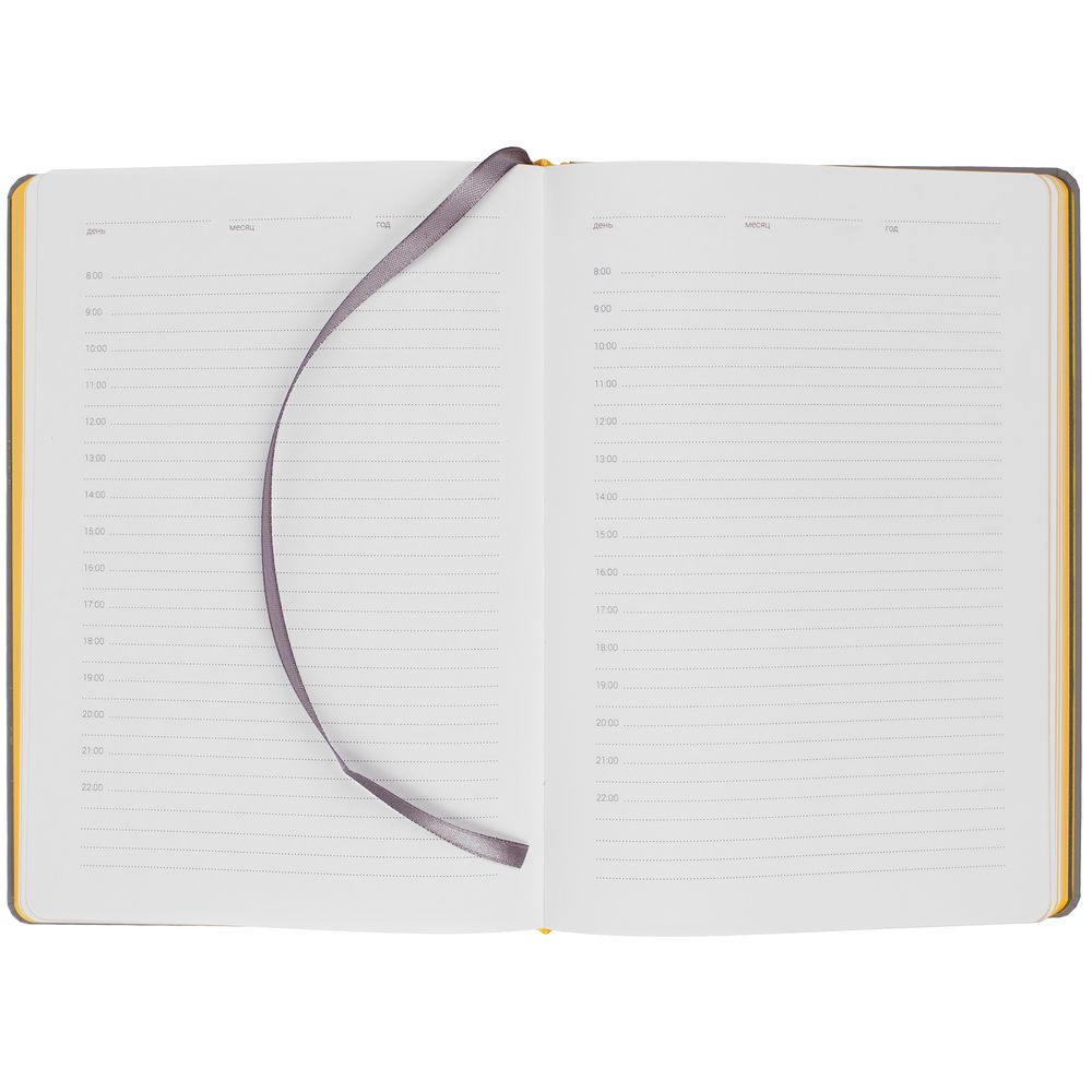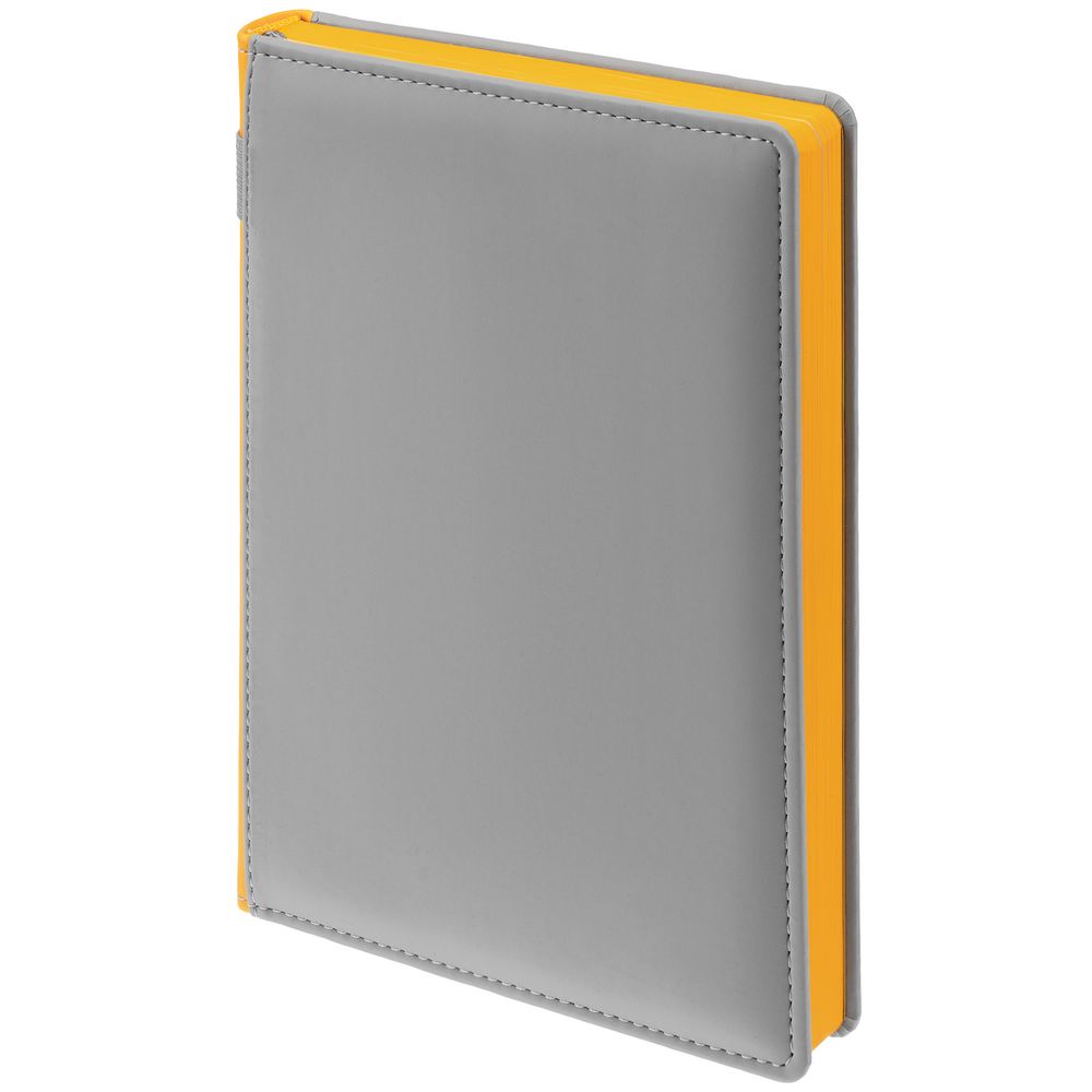 Твердая обложка с поролоном, материал обложки — Soft Touch, серый СС и Soft Touch, желтый КК. На корешке ежедневника находится петля из резинки.