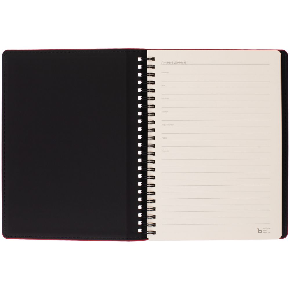 Ежедневник с блоком на пружине в твердой обложке, выполнен из материалов Nubuk Touch, красный PP и Soft Touch, черный AA.