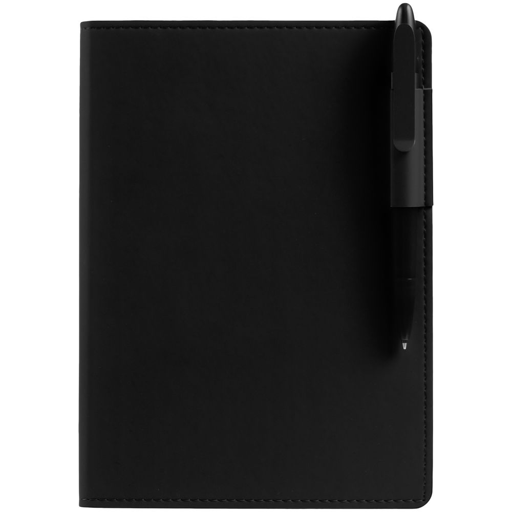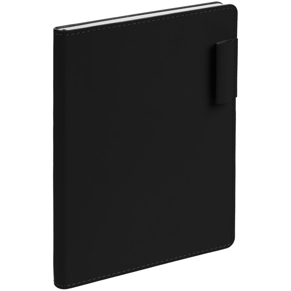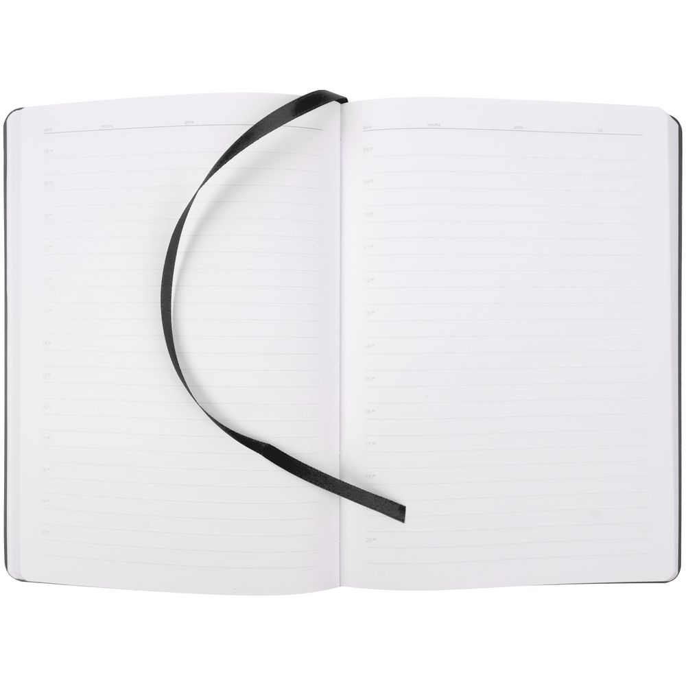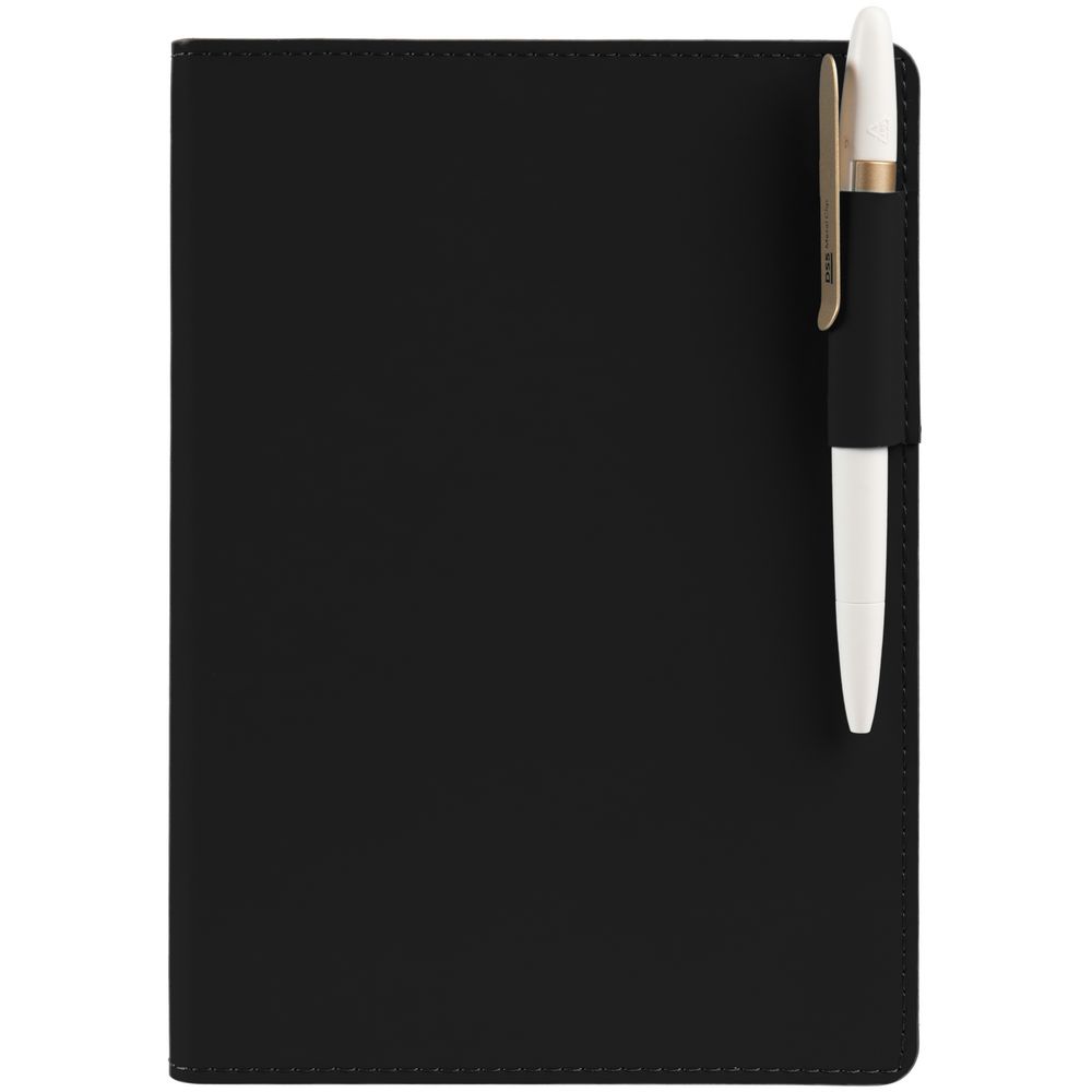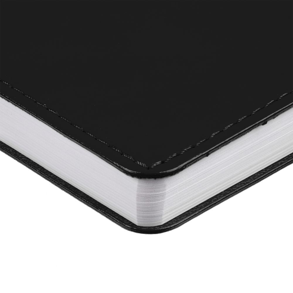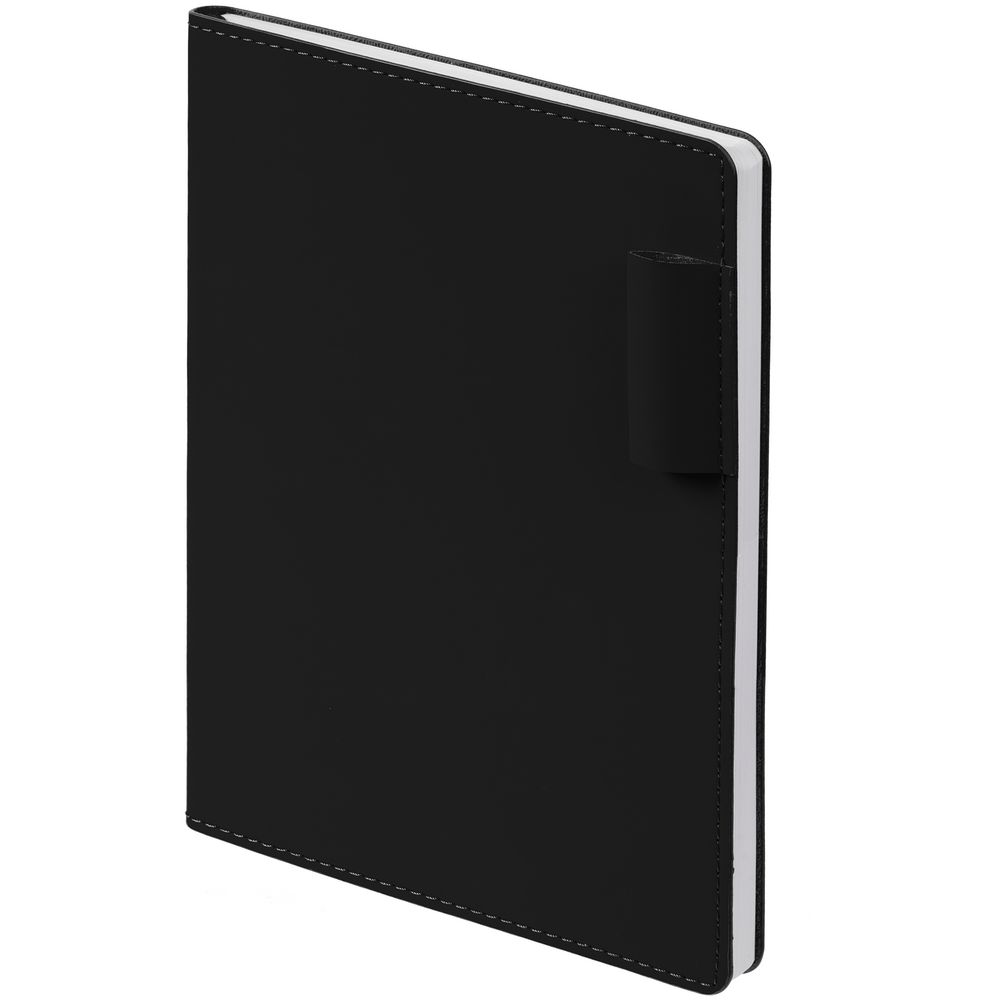 Ежедневник с гибкой обложкой из материала Soft Touch, черный АА и Latte, черный (внутренний материал), дополнен петелькой для ручки из покровного материала, капталом, ляссе и закрашенным срезом обложки в цвет материала.