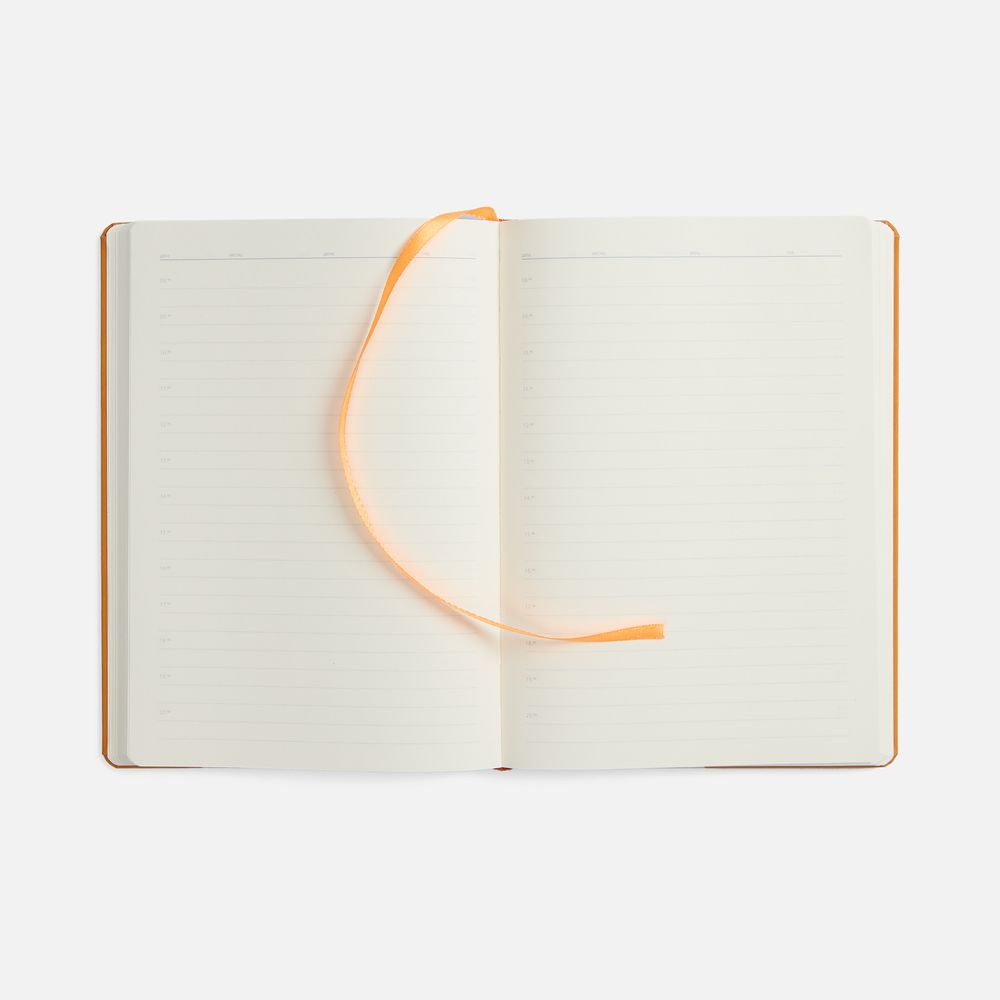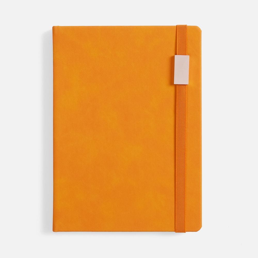 Ежедневник с твердой обложкой, выполнен из материала Nubuck Touch, оранжевый OO, дополнен ляссе в цвет обложки.