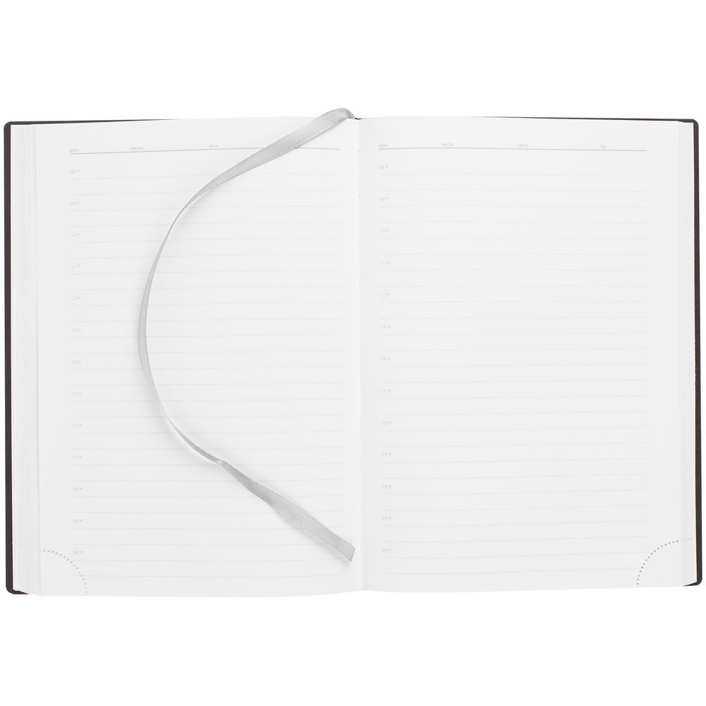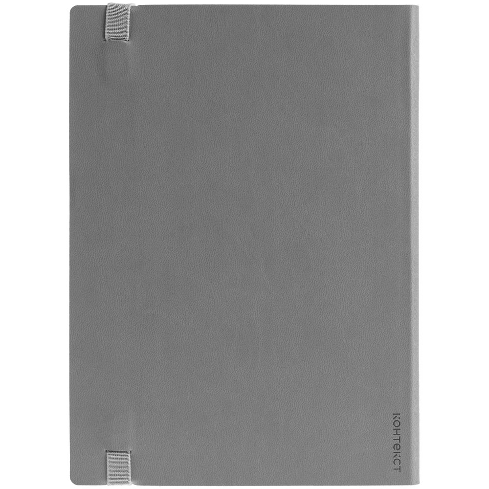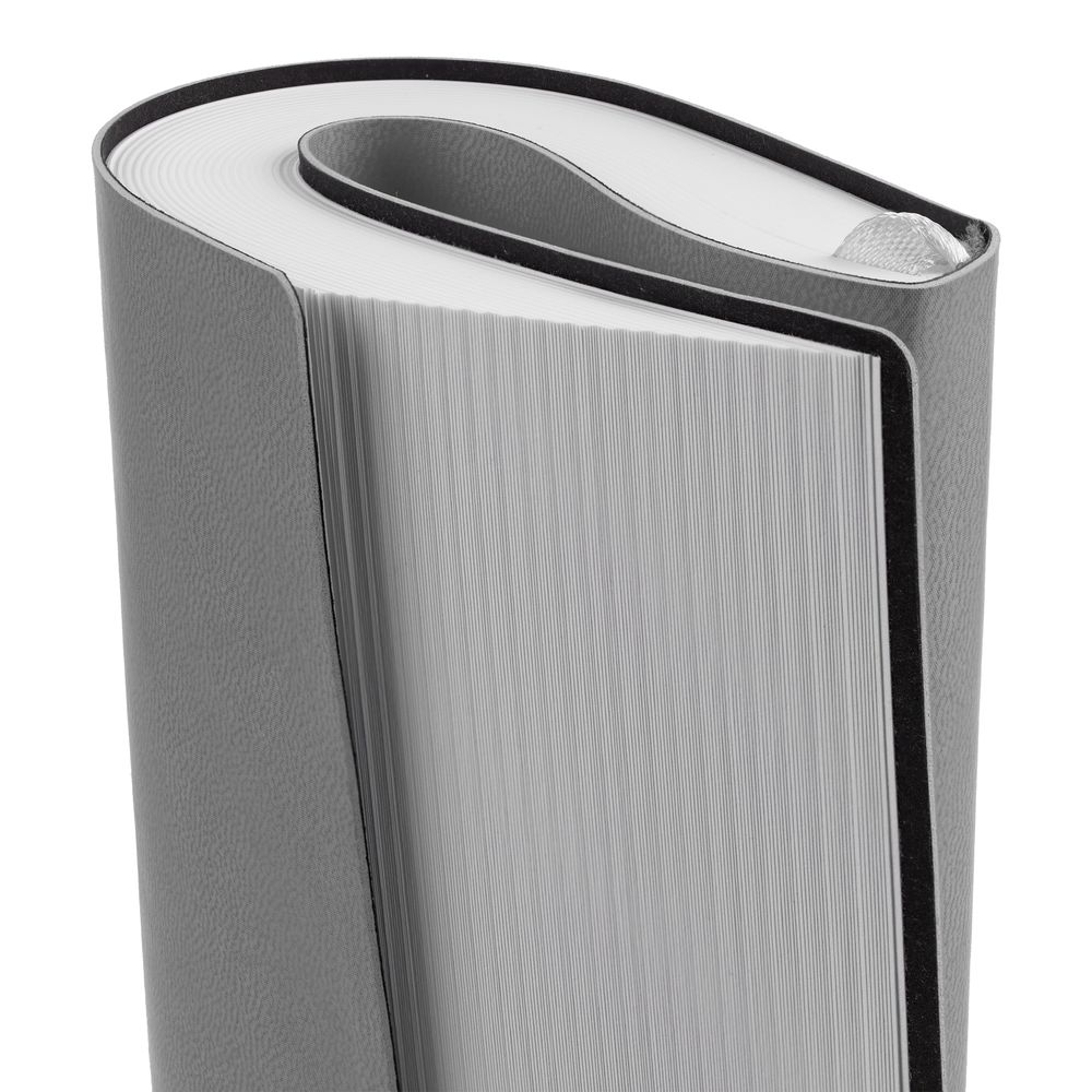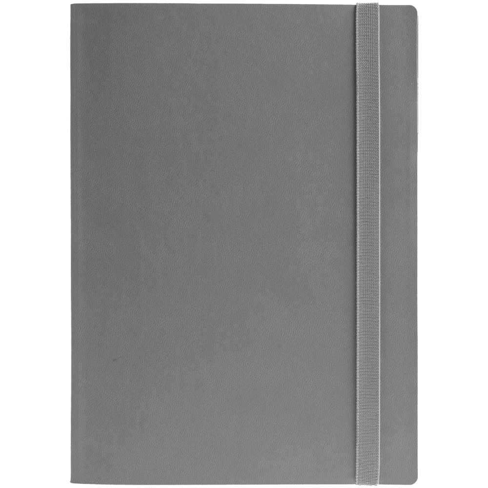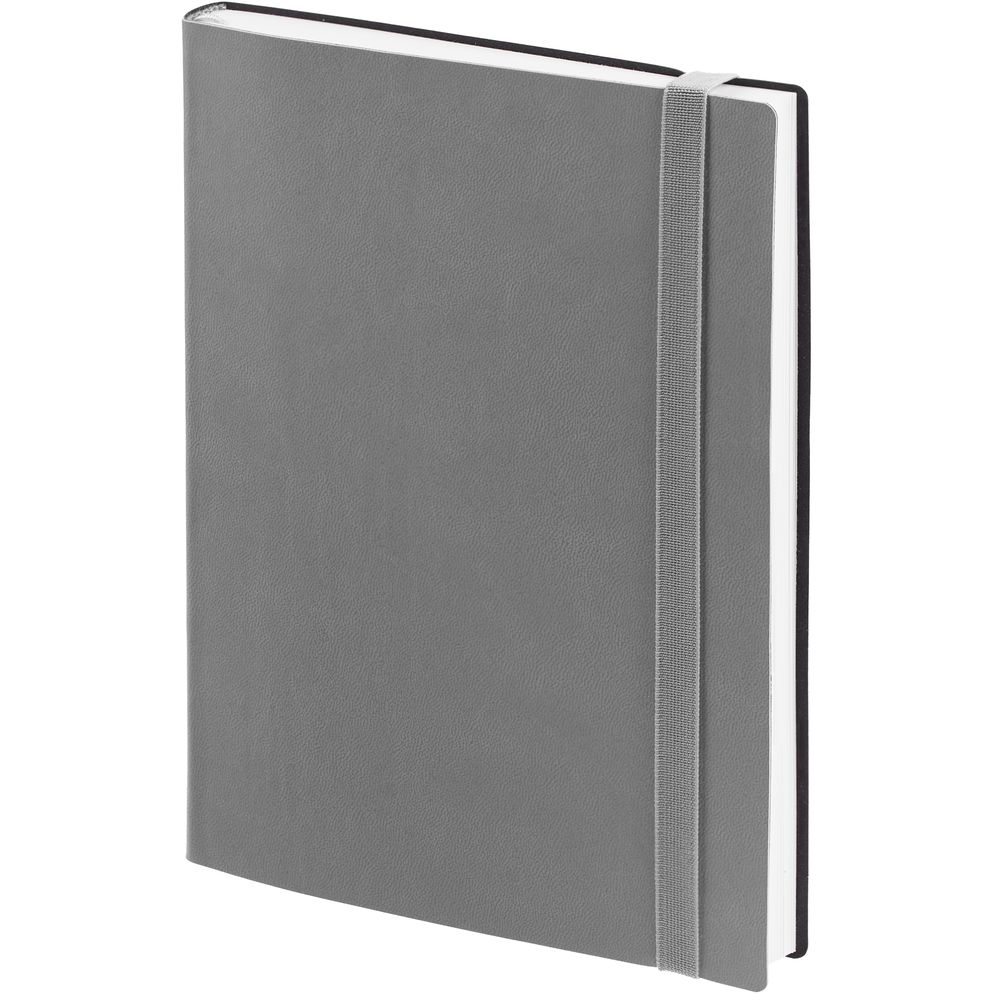 Ежедневник с гибкой обложкой выполнен из материала Latte, серый СС, и дополнен резинкой шириной 1 см, капталом и ляссе серого цвета.