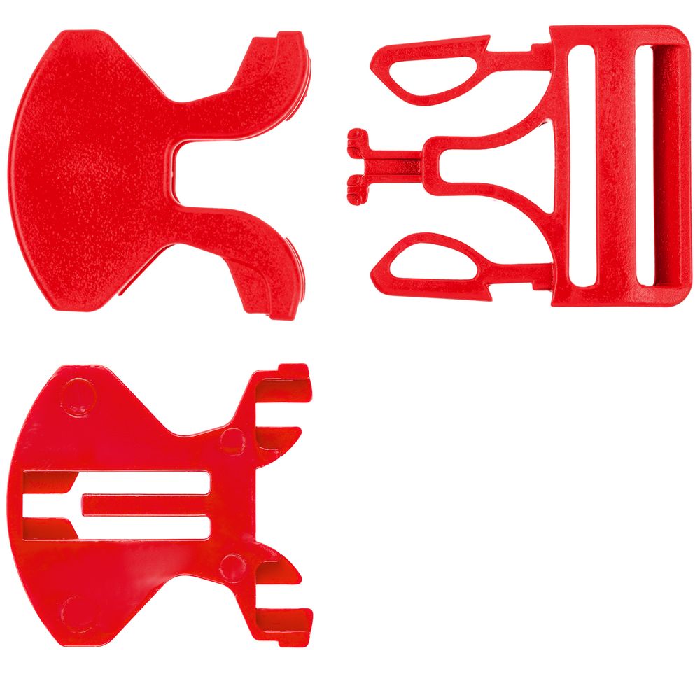 Особенность этой пряжки в том, что она состоит из 3 частей, две из которых крепятся напрямую на изделие, и для их установки необходим специальный инструмент. Третья деталь фиксируется на стропе.