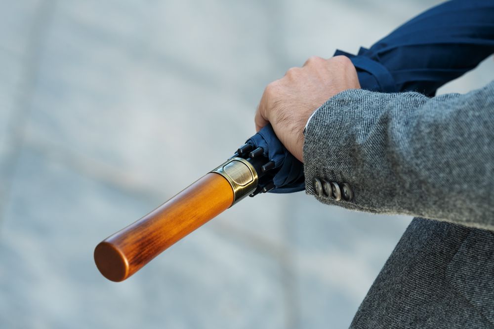 - Прямая деревянная ручка с петлей из натуральной кожи и кнопкой открытия зонта