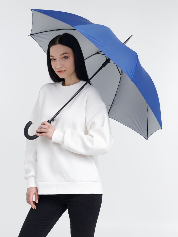 Легкий зонт-трость классической формы, который выглядит нескучно благодаря современным деталям исполнения — серебристому покрытию на внутренней части купола и мягкой прорезиненной ручке.