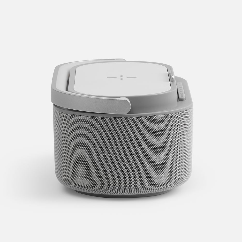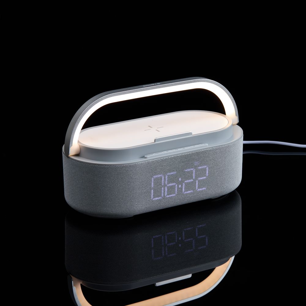 Veske — это Bluetooth-колонка с электронными часами, площадкой для беспроводной зарядки смартфона и подсветкой.