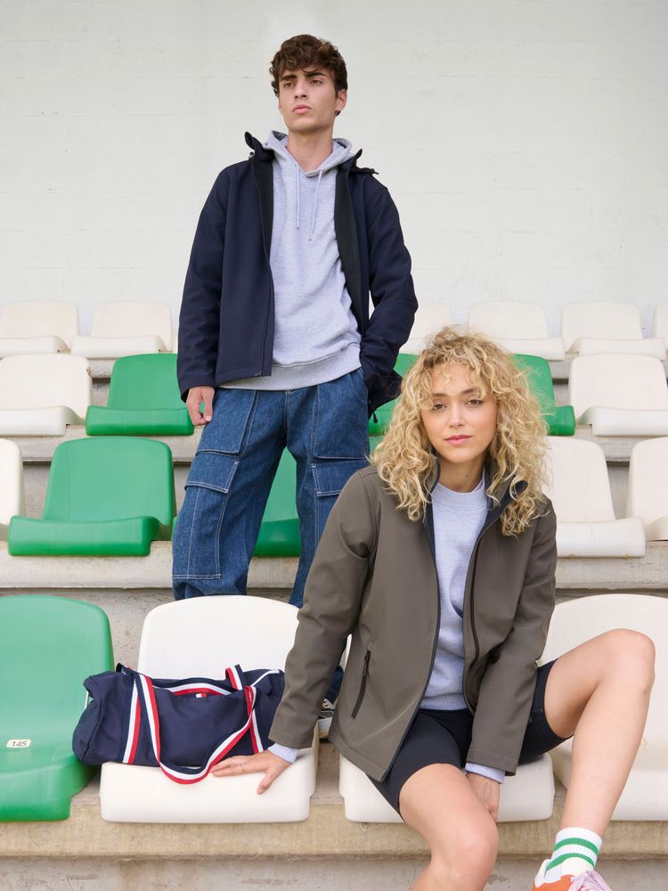 внешняя сторона — переработанный полиэстер, 100%; софтшелл, плотность 280 г/м²; изнанка — полиэстер 100%, флис