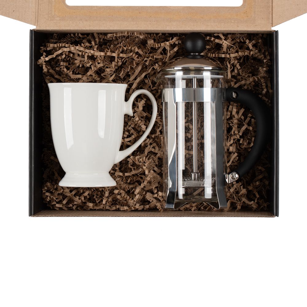 френч-пресс — боросиликатное стекло; нержавеющая сталь; кружка — костяной фарфор