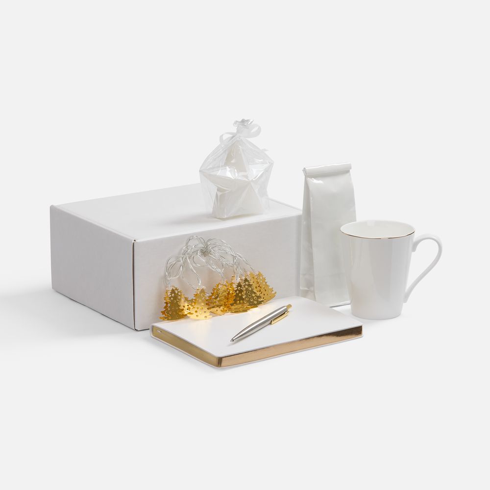 кружка — костяной фарфор; гирлянда — пластик, металл; свеча — парафин; ежедневник — искусственная кожа; ручка — металл
