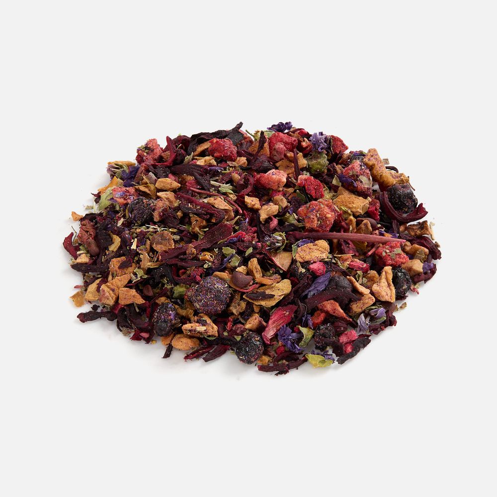 Состав: каркаде, кусочки яблок, ягоды брусники сублимированные, ягоды черники сублимированные, кусочки малины сублимированные, кусочки клубники сублимированные, цветы мальвы, лист ежевики, ароматизатор черники и малины.
