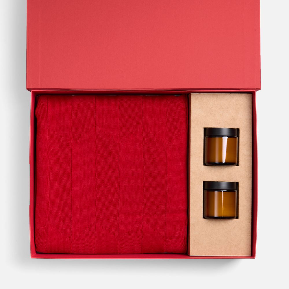 плед — акрил 100%, плотность 286 г/м²; подсвечник — стекло, крышка — пластик; свеча — парафин, соевый воск, парфюмерная композиция; коробка — переплетный картон, бумага Сurious