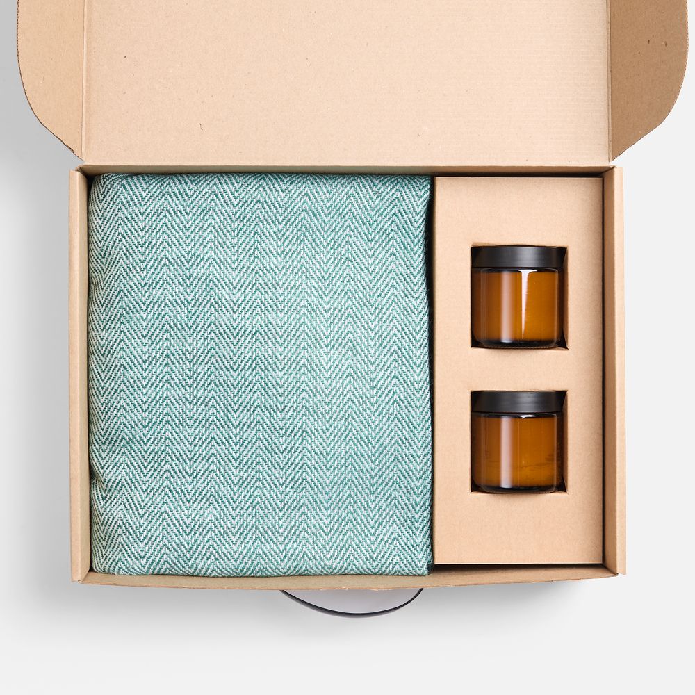 плед — шерсть, 15%; хлопок, 5%; полиэстер, 60%; акрил, 20%, плотность 200 г/м²; подсвечник — стекло, крышка — пластик; свеча — парафин, соевый воск, парфюмерная композиция; коробка — микрогофрокартон, Т-23Е