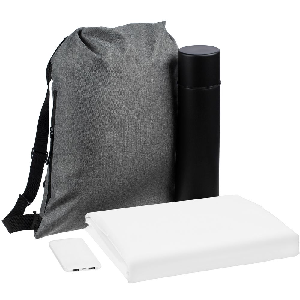 термос — нержавеющая сталь, пластик; аккумулятор — пластик, покрытие софт-тач; дождевик — полиэстер 100%, плотность 60 г/м²; таффета; рюкзак — полиэстер, 300D