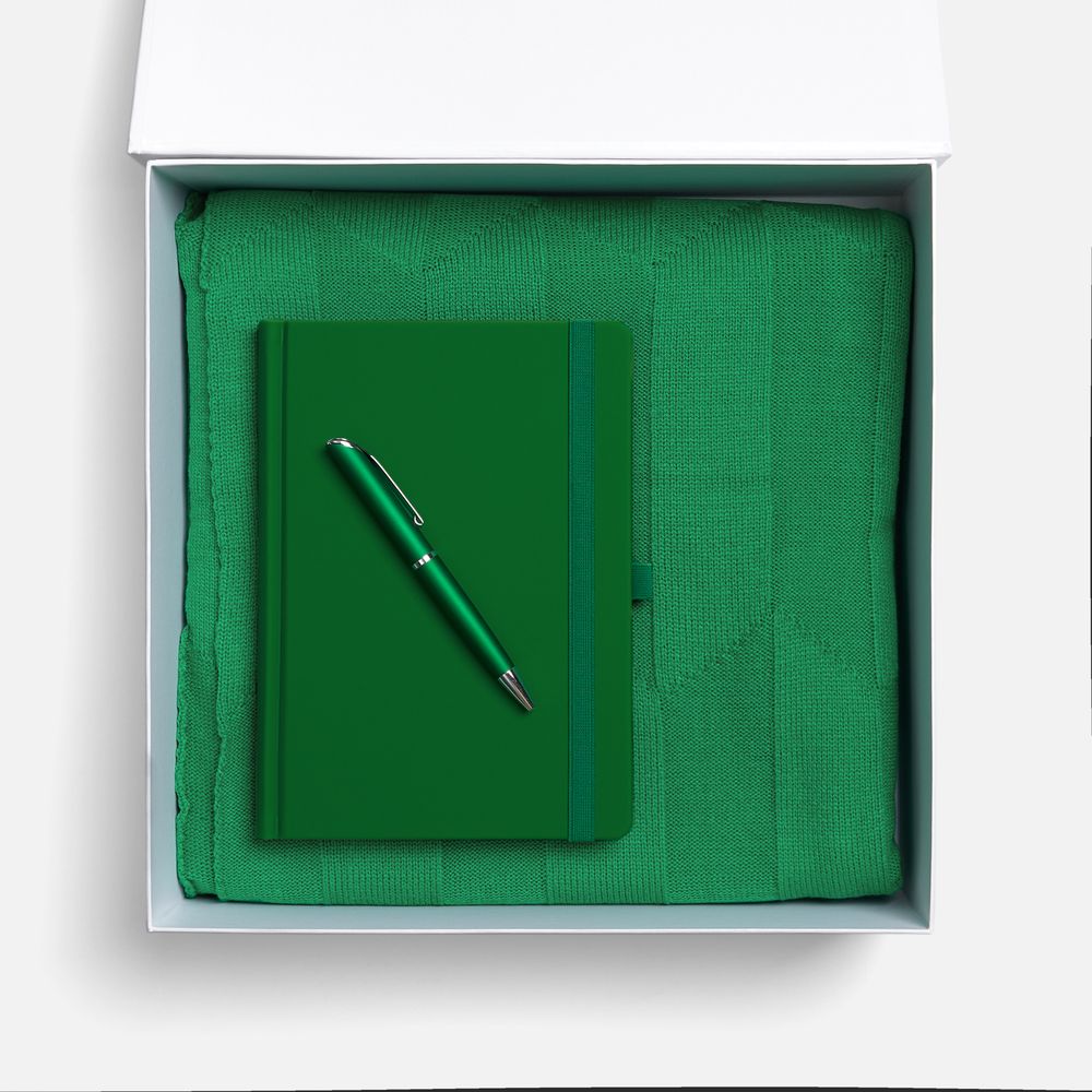 Однотонный набор с основной канцелярией и пледом — классика жанра в уютном исполнении. С компактным ежедневинком будет удобно делать заметки в любое время — благодаря петельке для ручки любимый пишущий инструмент будет всегда под рукой. А изысканный акриловый плед с геометрическим узором позволит выразить самые теплые пожелания и ддобавит плавных линий в интерьер.
