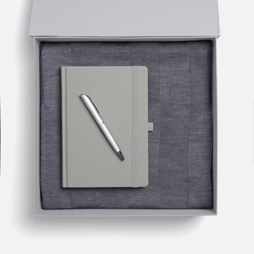 Однотонный набор с основной канцелярией и пледом — классика жанра в уютном исполнении. С компактным ежедневинком будет удобно делать заметки в любое время — благодаря петельке для ручки любимый пишущий инструмент будет всегда под рукой. А изысканный акриловый плед с геометрическим узором позволит выразить самые теплые пожелания и ддобавит плавных линий в интерьер.