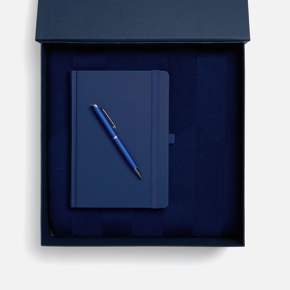 Однотонный набор с основной канцелярией и пледом — классика жанра в уютном исполнении. С компактным ежедневинком будет удобно делать заметки в любое время — благодаря петельке для ручки любимый пишущий инструмент будет всегда под рукой. А изысканный акриловый плед с геометрическим узором позволит выразить самые теплые пожелания и ддобавит плавных линий в интерьер.