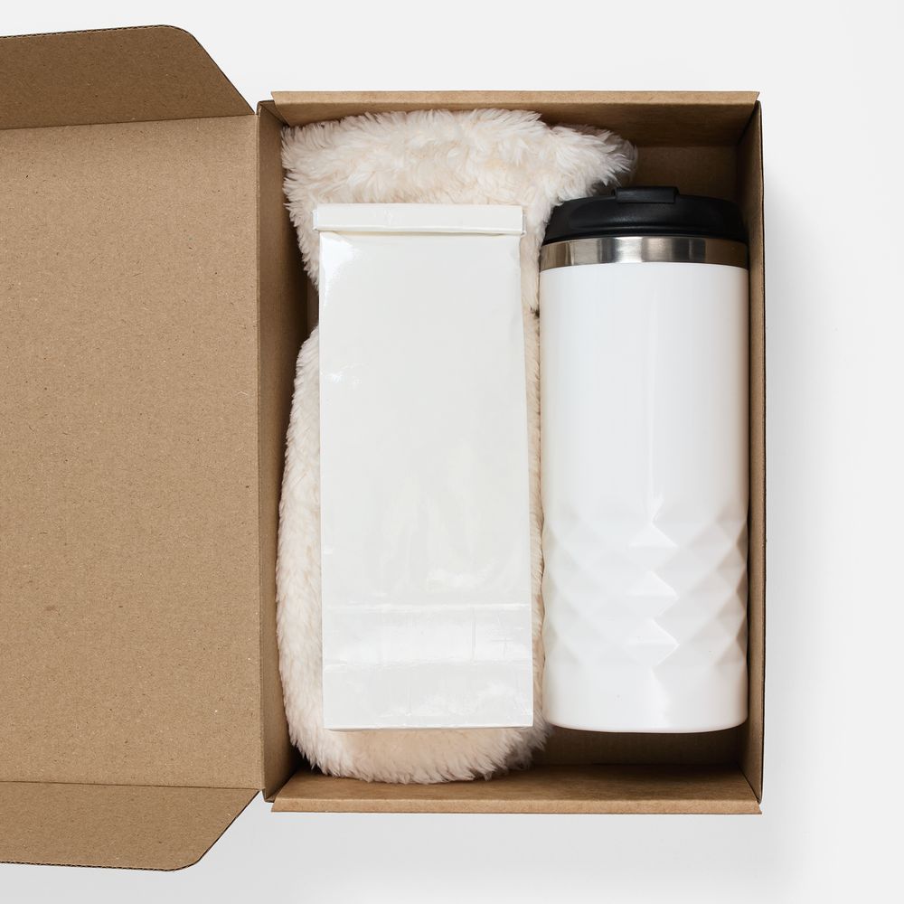 термостакан, крышка — пластик; внутренняя стенка — нержавеющая сталь; варежки — полиэстер 100%, плотность 280 г/м², длинноворсовый флис; коробка — микрогофрокартон