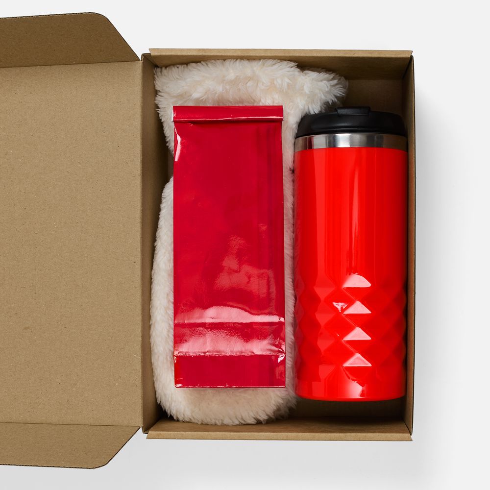 термостакан, крышка — пластик; внутренняя стенка — нержавеющая сталь; варежки — полиэстер 100%, плотность 280 г/м², длинноворсовый флис; коробка — микрогофрокартон