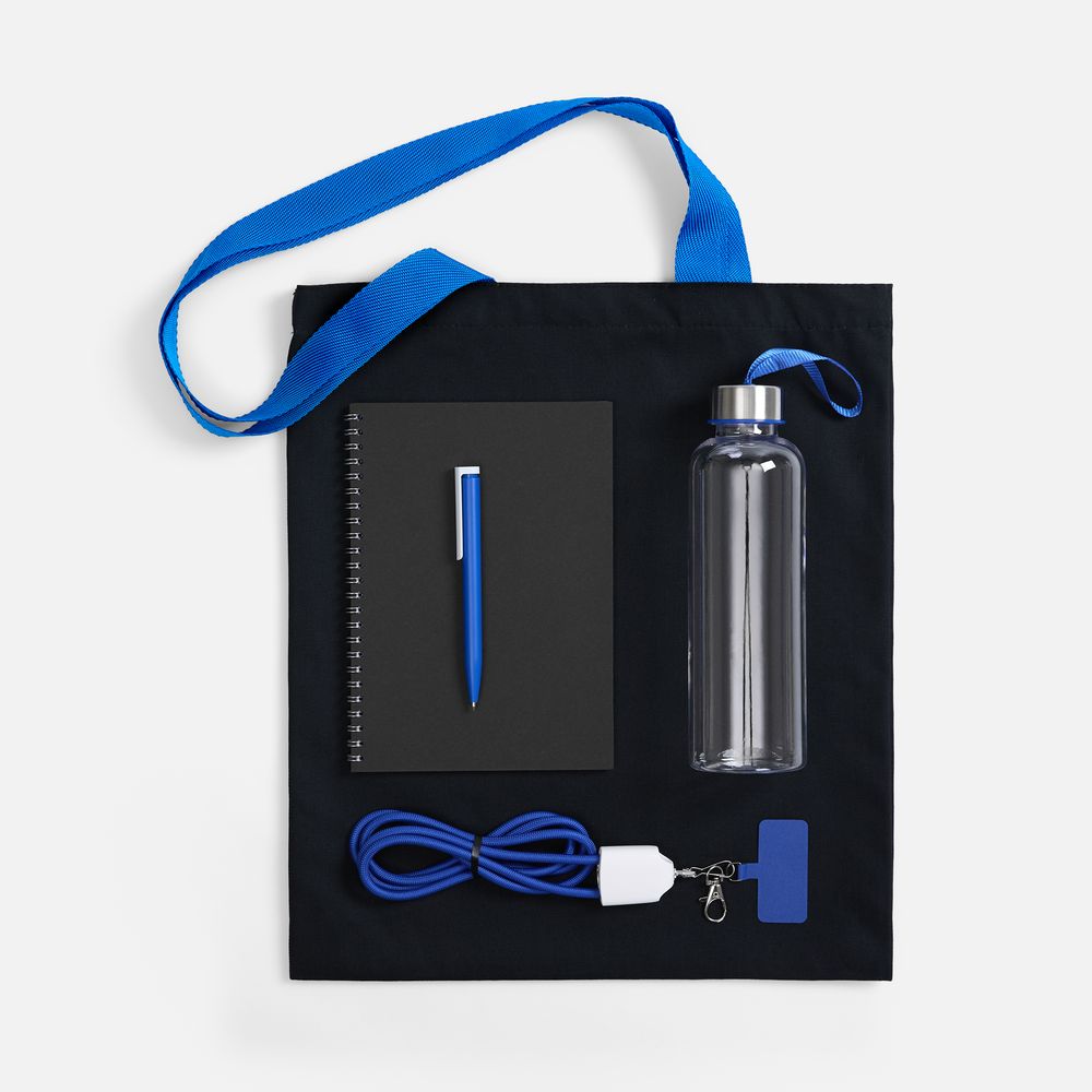 сумка — хлопок, 240 г/м²; ручки — полиэстер; кабель-ланьярд — нейлон, пластик; металл; бутылка — пластик, пищевой; крышка — металл, пластик; блокнот — бумага, картон; ручка — пластик