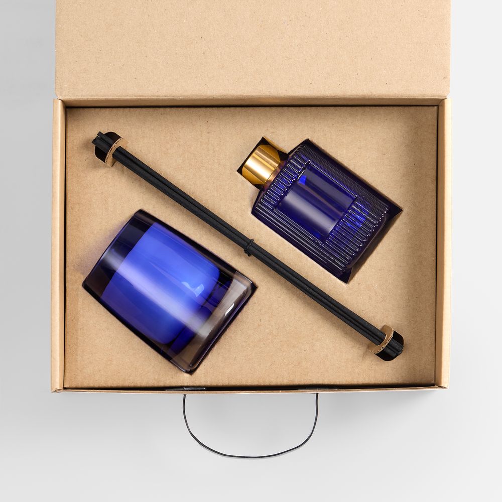 флакон, подсвечник — стекло, палочки из файбера; свеча — воск; коробка — микрогофрокартон