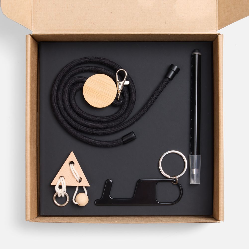 скетчбук — искусственная кожа; покрытие софт-тач; шнурок — дерево, хлопок; металл; головоломка — береза, шнур — хлопок; карандаш — металл, алюминий; брелок — металл; коробка — микрогофрокартон