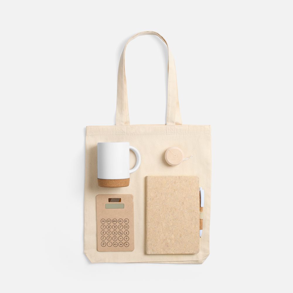 блокнот — пробка; кружка — каменная керамика, подставка — пробка; калькулятор — картон; сумка — хлопок 100%, плотность 210 г/м²; саржа; игрушка-антистресс — дерево; ручка — пластик, пробка