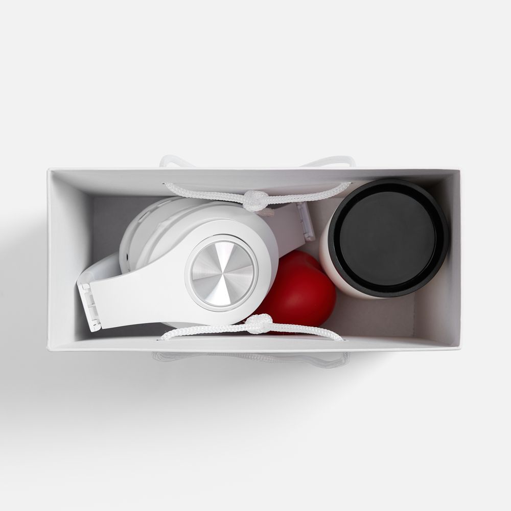 наушники — пластик; термостакан — нержавеющая сталь, матовое покрытие; крышка — пластик, силикон; коробка — переплетный картон, бумага Magic; антистресс — вспененный полиуретан