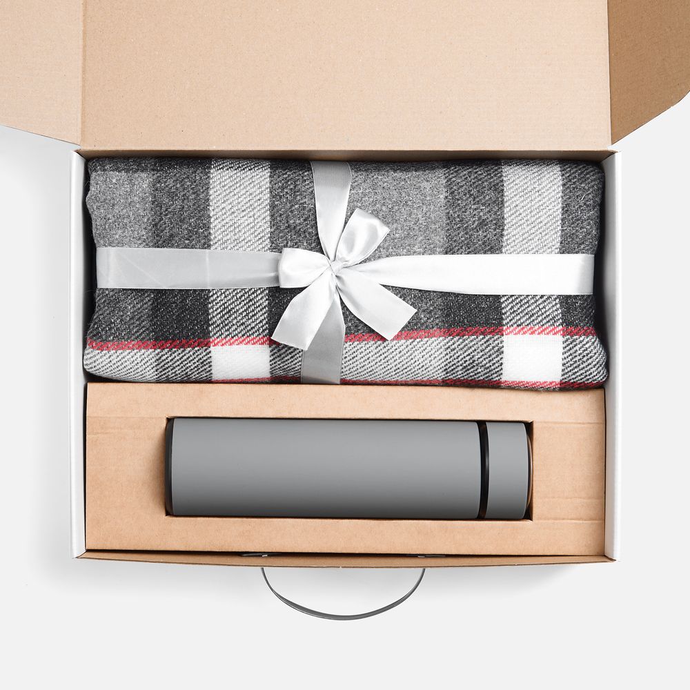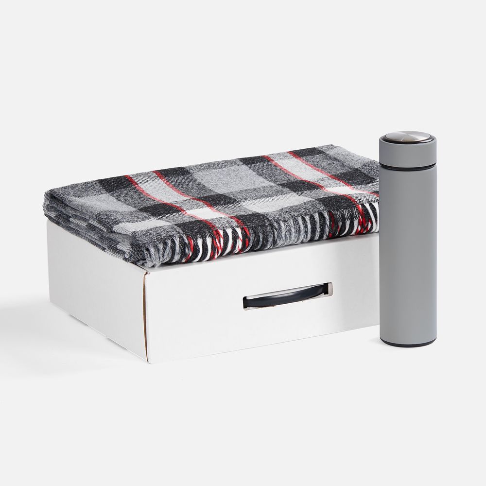 плед — шерсть, 15%; хлопок, 5%; полиэстер 60%; акрил, 20%, плотность 200 г/м²; термос — нержавеющая сталь, 304; покрытие софт-тач; коробка — картон
