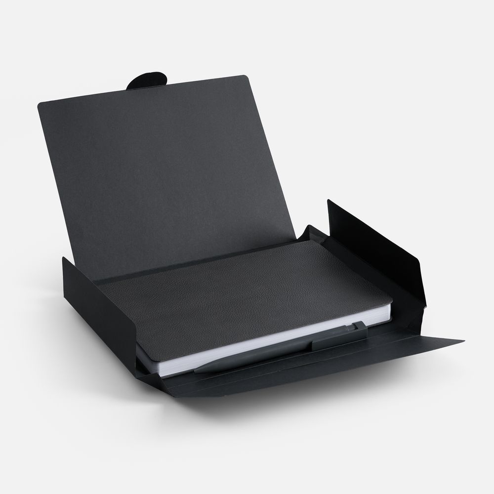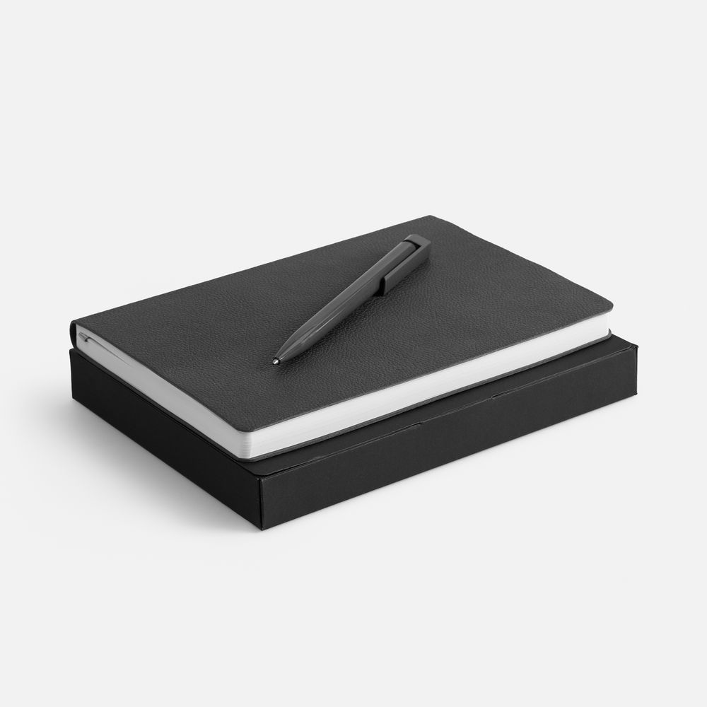 Недатированный ежедневник с гибкой обложкой из фактурного материала La Fite и металлическим шильдом на ляссе и ручка в тон, упакованные в подарочную коробку из дизайнерского картона.
