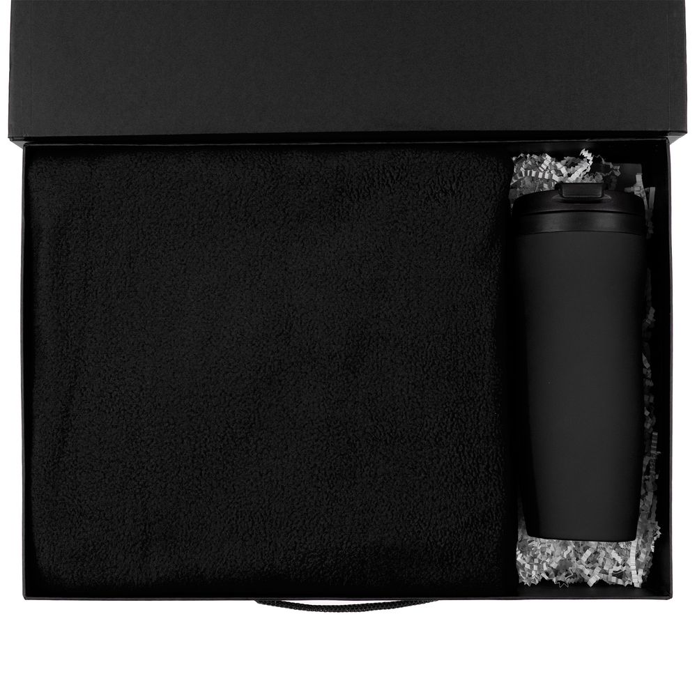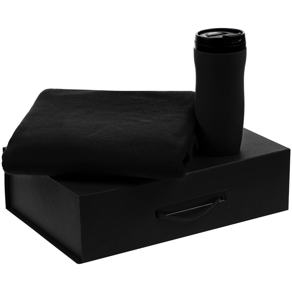 термостакан — пластик, крышка, внутренняя колба; нержавеющая сталь, корпус; покрытие софт-тач; плед — флис, плотность 180 г/м²; коробка — переплетный картон; наполнитель — бумага