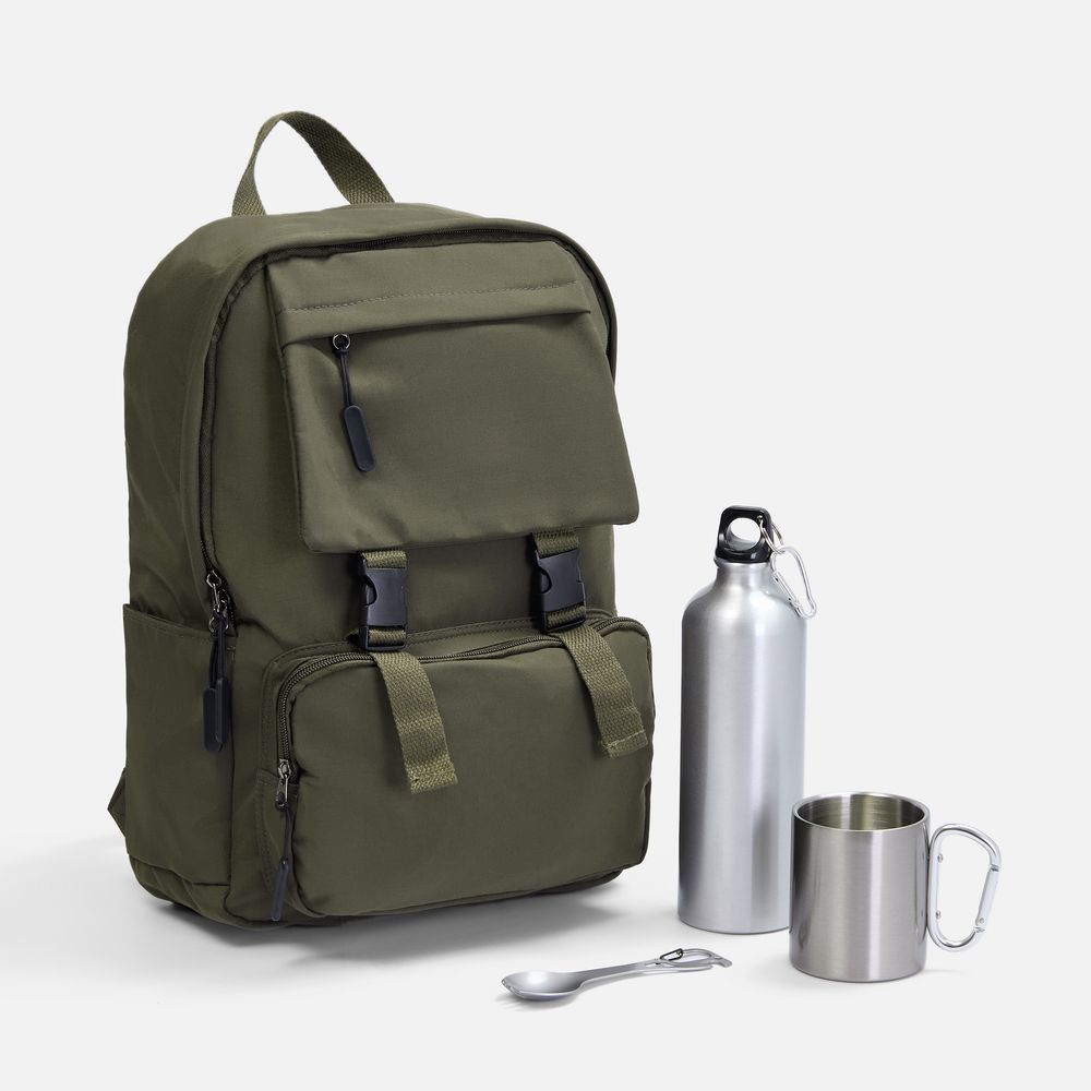 рюкзак — нейлон; кружка — пищевая сталь, 304, внутри — нержавеющая сталь, 201; бутылка — алюминий; столовый прибор — нержавеющая сталь, 420