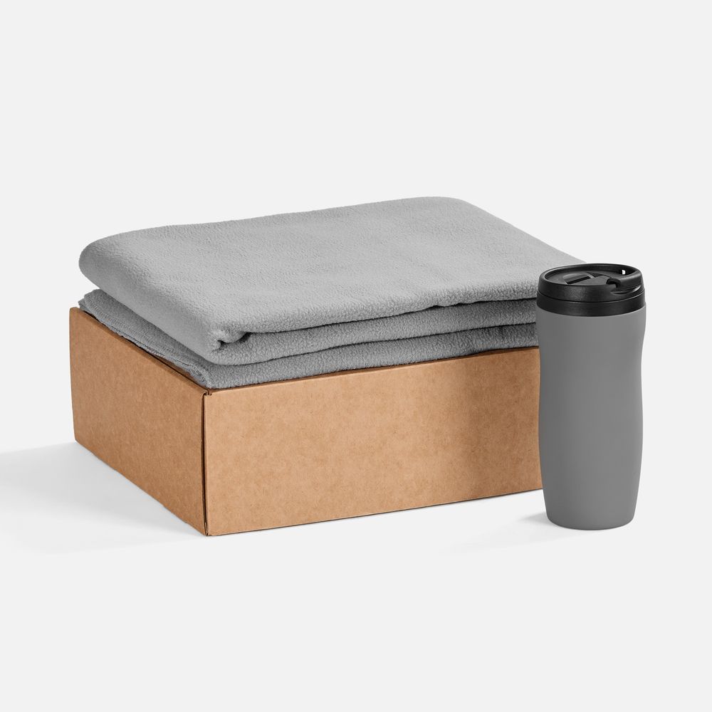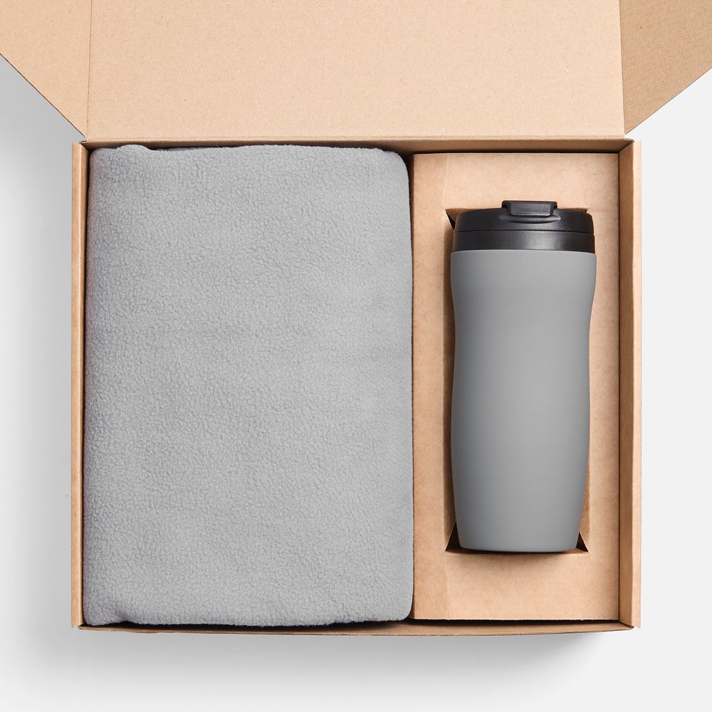 крышка, внутренняя колба — пластик; корпус — нержавеющая сталь; покрытие софт-тач; плед — флис, плотность 180 г/м²; коробка — микрогофрокартон, Т-23Е