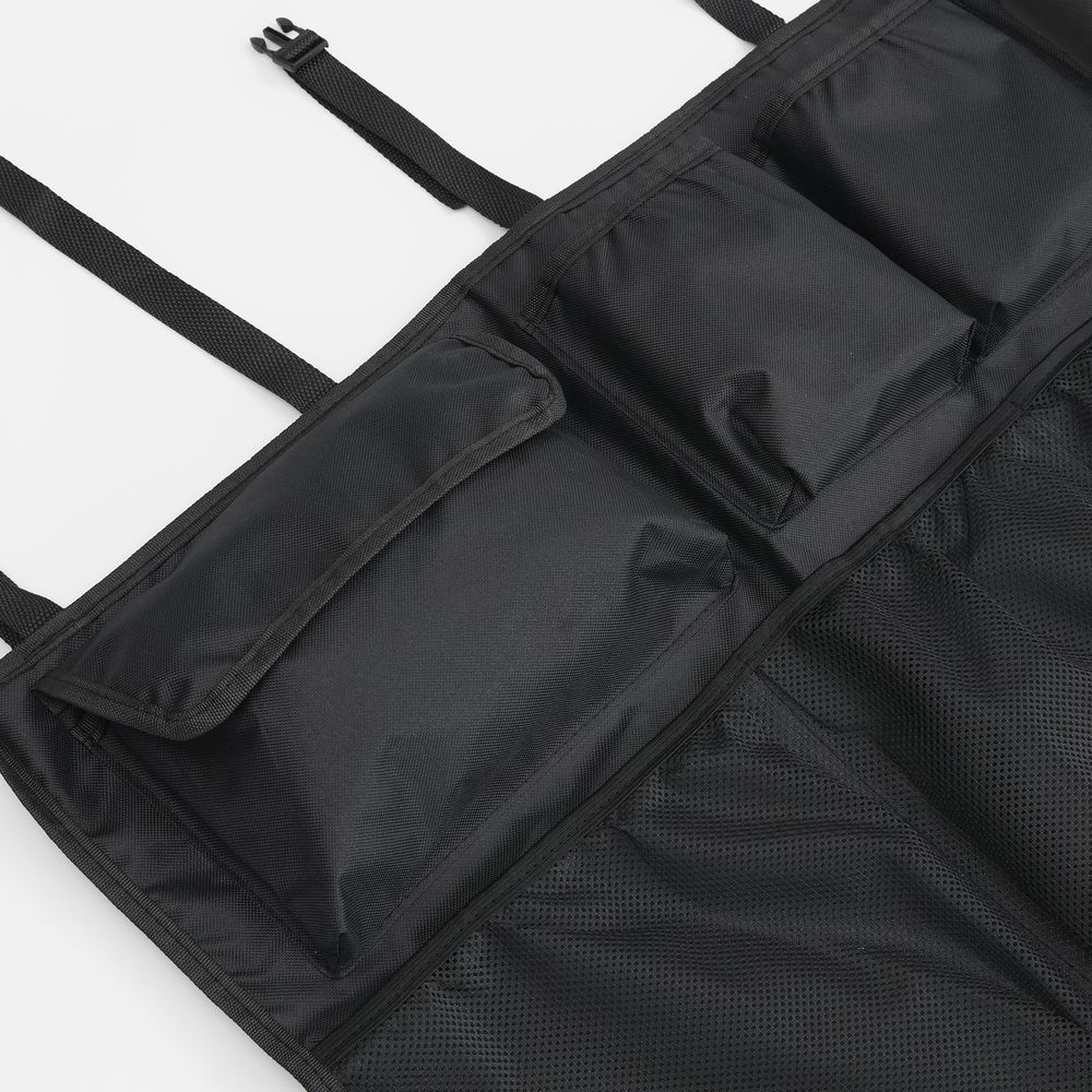 В органайзере имеются разные по форме и типу карманы: карманы-сетки, карманы с крышкой на липучке, открытые карманы.Конструкция крепится ремнями за подголовники задних сидений. Дополнительно на задней части органайзера имеются ленты-липучки, которые обеспечивают полное прилегание органайзера к спинкам задних кресел.