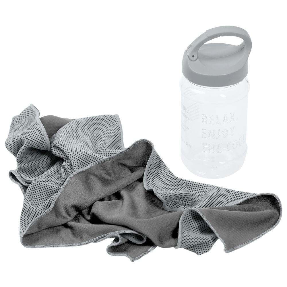 бутылка — пластик; полотенце — полиэстер, 45%, нейлон 55%, плотность 160 г/м²